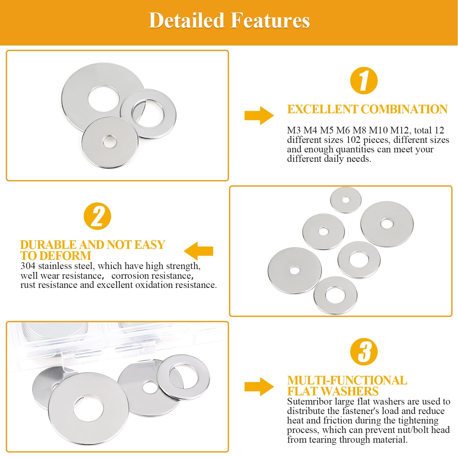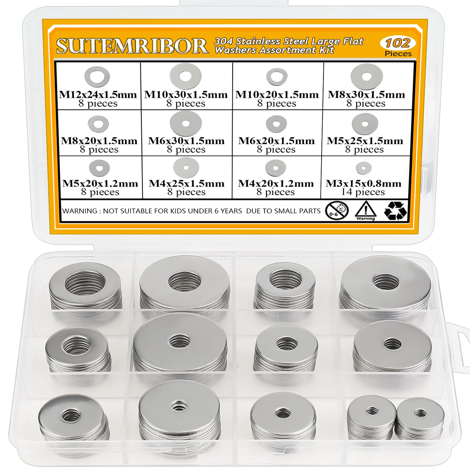 - √ Package Included: Sutemribor 102 Pieces M3 M4 M5 M6 M8 M10 M12 stainless fender washers are packaged in a clear plastic box, which is very convenient for you to carry and use. If you have any questions about Sutemribor lock washers, please free to contact with us and we will reply to you as soon as possible.