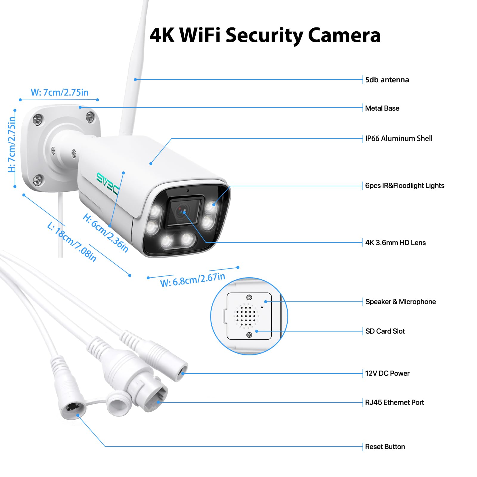 - 【4K Super HD & Night Vision】: SV3C Newest bullet WiFi IP camera with 1/2.8” IMX415 CMOS sensor, displaying images at 4K/8MP 3840 X 2160 resolution. 4K outdoor camera also supports to adjust the resolution to 2560x1440(4MP) and 1920x1080(1080P/2MP). 4K IP camera has built-in 6 LED lights, support Black & White night vision(Infrared lights turn on, up to 160ft) and full color night vision(floodlights turn on, up to 60ft). Infrared light and floodlight can be turned off manually! WiFi with 8.0 megapixel HD IP camera, maximum resolution 3840*2160.