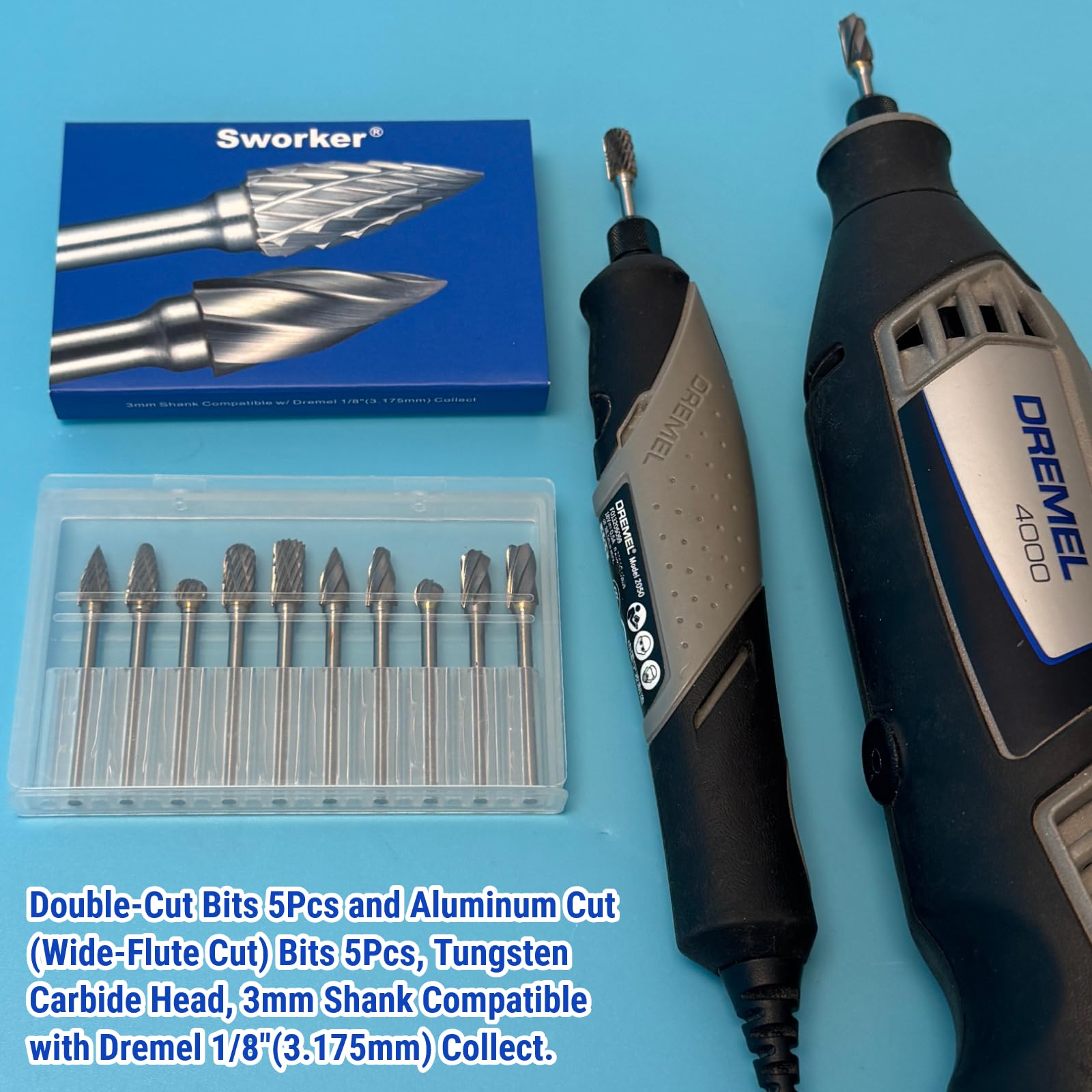 Sworker 10 Pcs Carbide Burr Set 1/8" Shank Compatible with Dremel Bits Double Cut and Aluminum Cut (Wide-Flute Cut) Rotary Tools Attachment Kit Rasp Metal Wood Stone Steel Grinding Carving Cutting