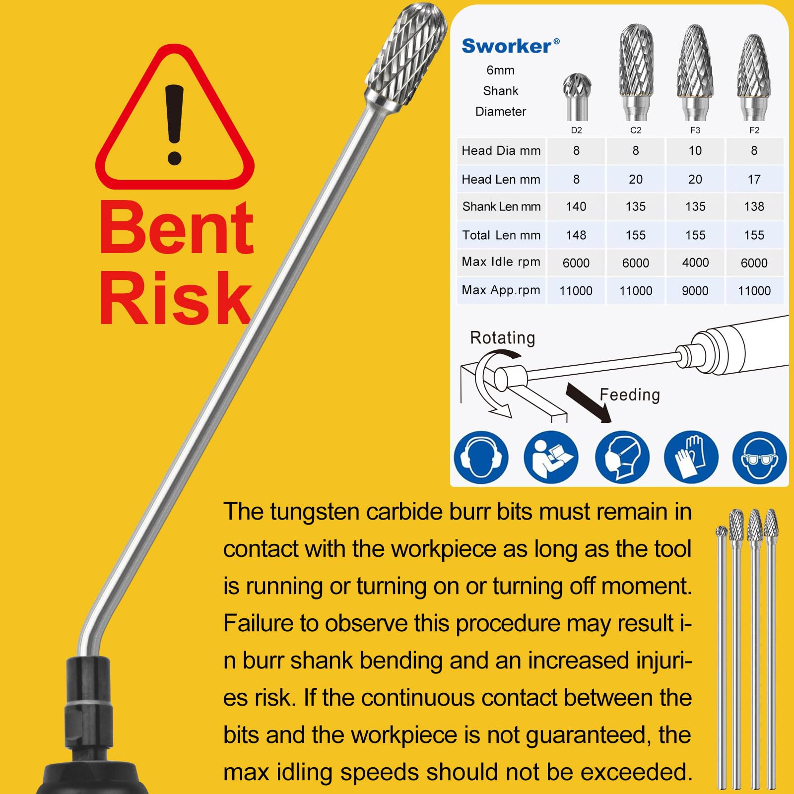 - Bent Risk! The tungsten carbide burr bits must remain in contact with the workpiece as long as the tool is running or turning on or turning off moment. Failure to observe this procedure may result in burr shank bending and an increased injuries risk. If the continuous contact between the bits and the workpiece is not guaranteed, the max idling speeds should not be exceeded.