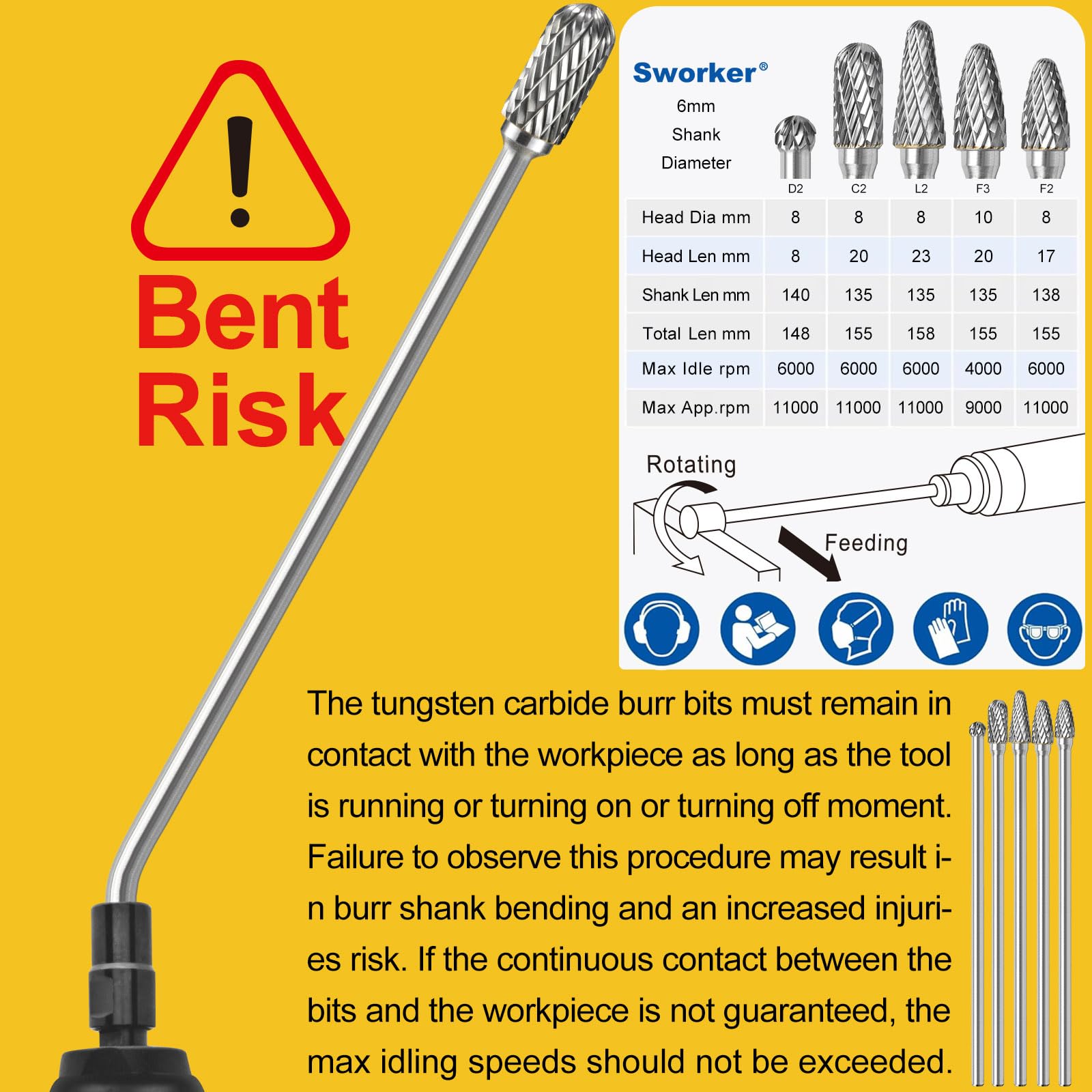 - Bent Risk! The tungsten carbide burr bits must remain in contact with the workpiece as long as the tool is running or turning on or turning off moment. Failure to observe this procedure may result in burr shank bending and an increased injuries risk. If the continuous contact between the bits and the workpiece is not guaranteed, the max idling speeds should not be exceeded.