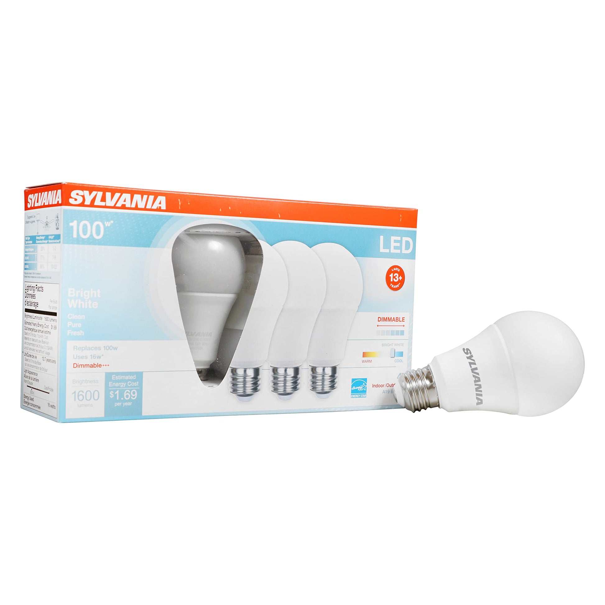 Details: Brighten your home with a LEDVANCE SYLVANIA 16W LED A19 light bulb! These bright white LED lamps are a great replacement for your 100W incandescent lamps. With just 16 watts, they will brighten your house with 1600 lumens of light. Ideal for use in ceiling lights or floor lamps, the SYLVANIA LED bulb illuminates the house and adds dimensions with accurate and vivid definition. Additionally, it will help you save energy costs because it requires less energy and lasts longer than incandescent lamps. In fact, it has a lifespan of 15,000 hours. See the difference a SYLVANIA 16W LED light bulb makes!.