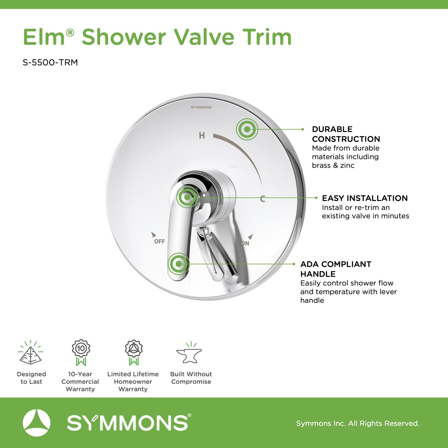 Details: The Symmons Elm Collection offers simple sophistication, blending sleek form and simple lines with an organic design. It's a natural fit with most bathroom interiors. Built from sturdy materials and plated in an abrasion resistant finish over solid metal, this Elm trim kit includes a brass escutcheon and lever handle. The ADA compliant adjustable lever can be turned to the hot and cold indicators on the solid brass cover plate to ensure custom water temperature. This shower trim kit includes everything needed for installation, meaning you can update your bathroom without replacing your valve. It's also backed by the Symmons Lifetime Limited Warranty and technical support team.