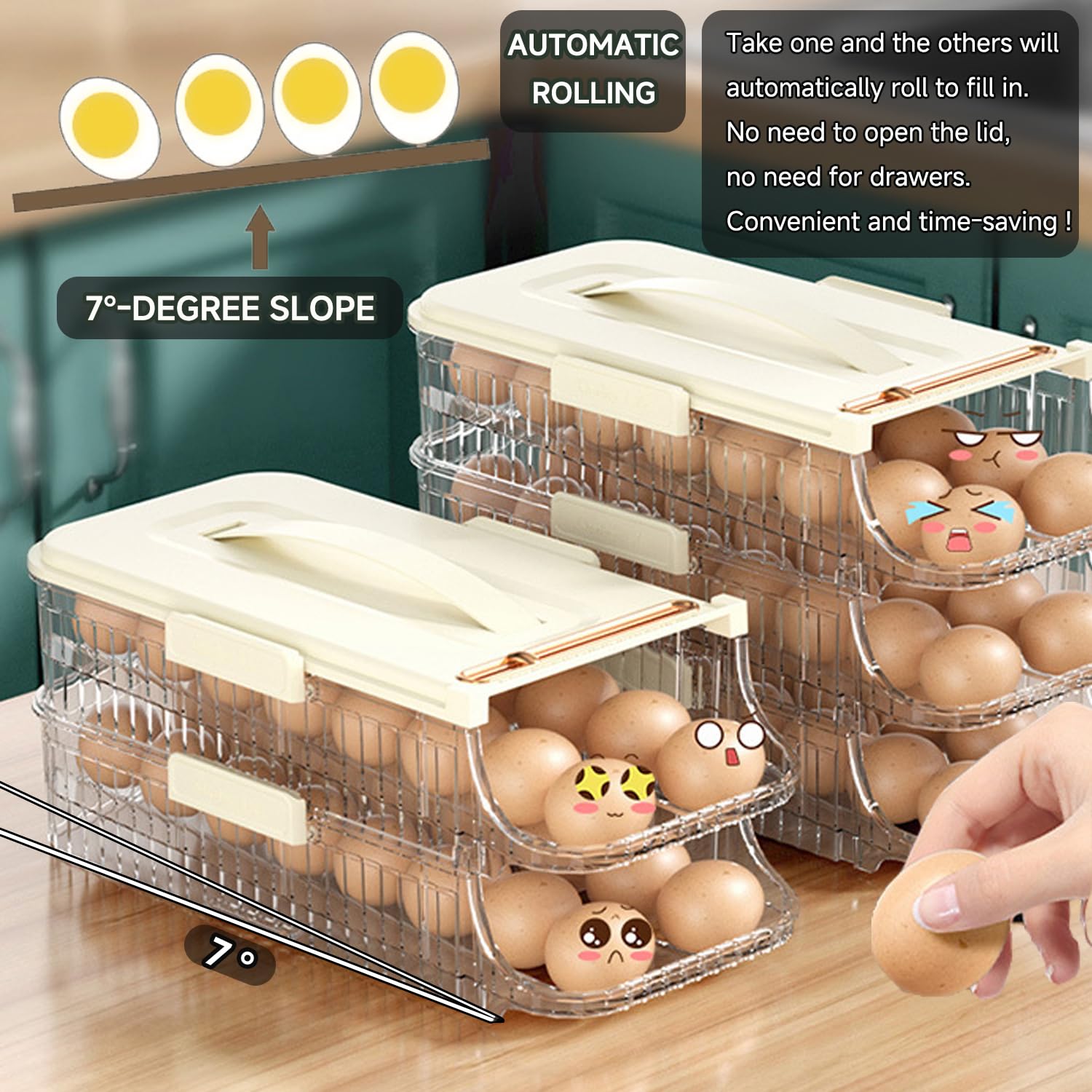 - 7° slope design angled tracks guide eggs smoothly roll down after taking away en egg. No need to take out the holder or open the lid. Save your time and effect【Sizes :see the description pictures】