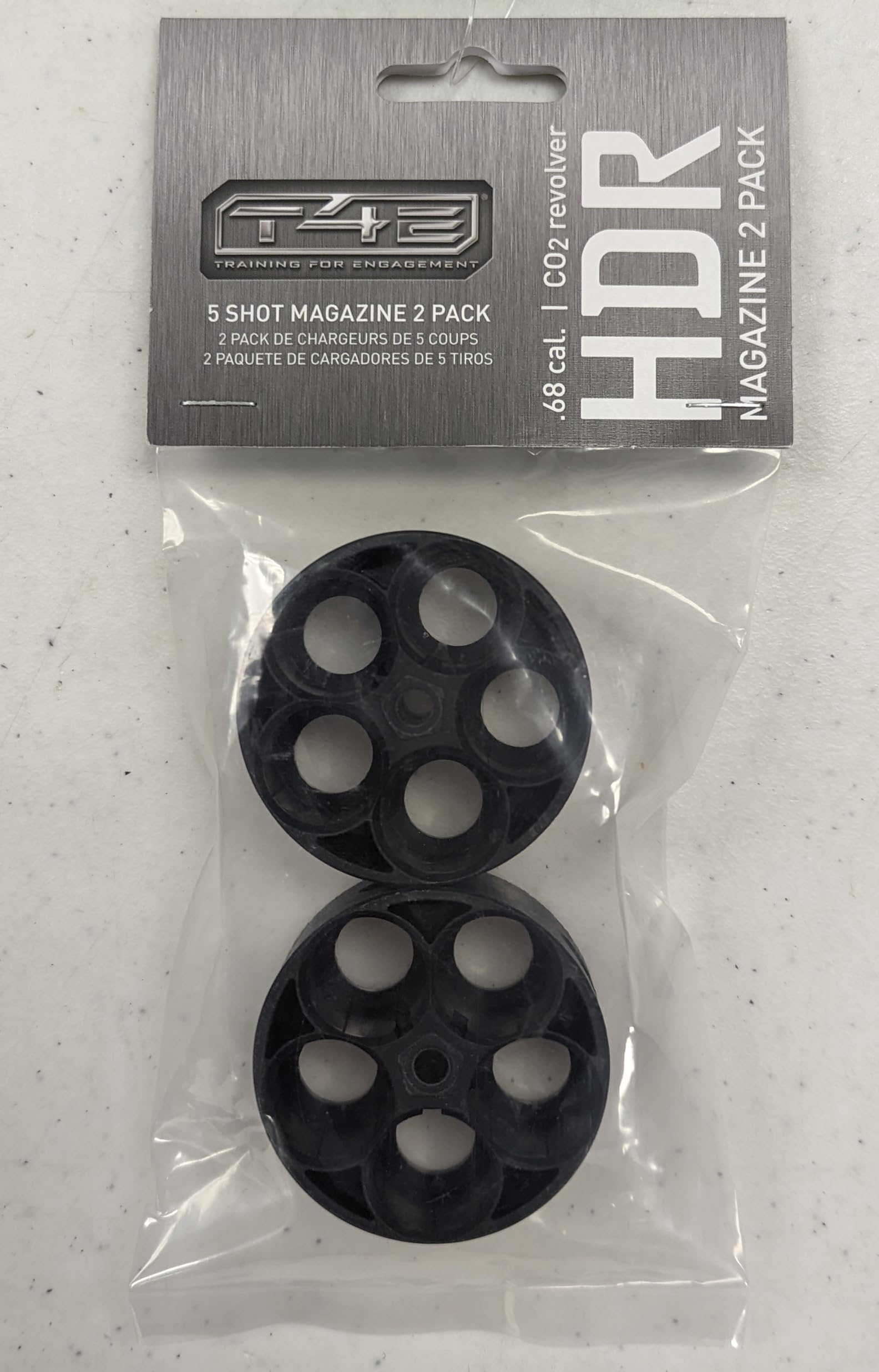 Details: Five round rotary mag. Compatible with the T4E HDR .68 Revolver Paintball Marker (2292138). Comes in a pack of 2.