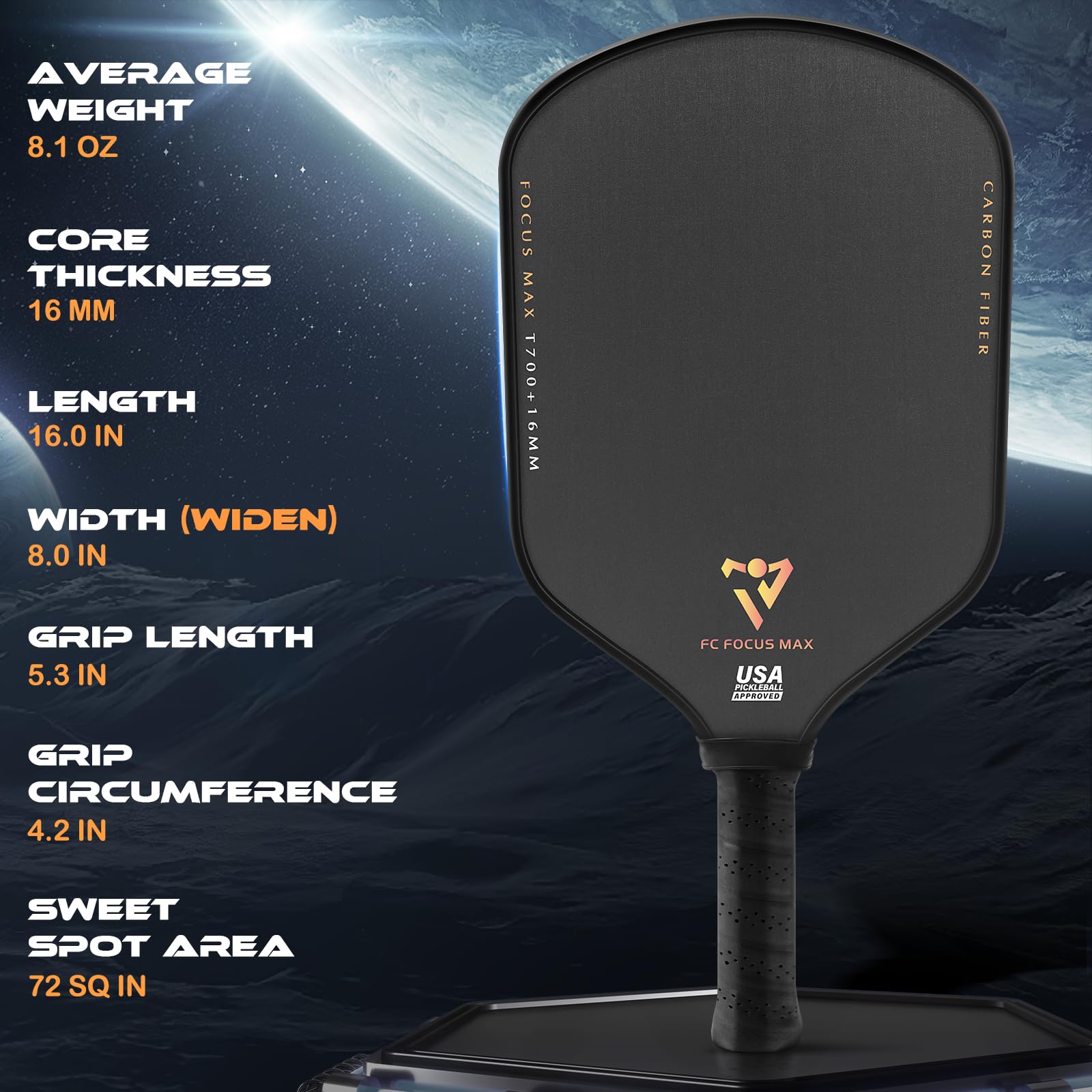 - 【Widebody Pickleball Paddles】 FC FOCUS MAX is Oversized Pickleball Paddles. Wideer racket for more power, the wider racket is perfect for players who play two-handed backhand drives, improving balance and providing extra leverage for a more powerful swing.