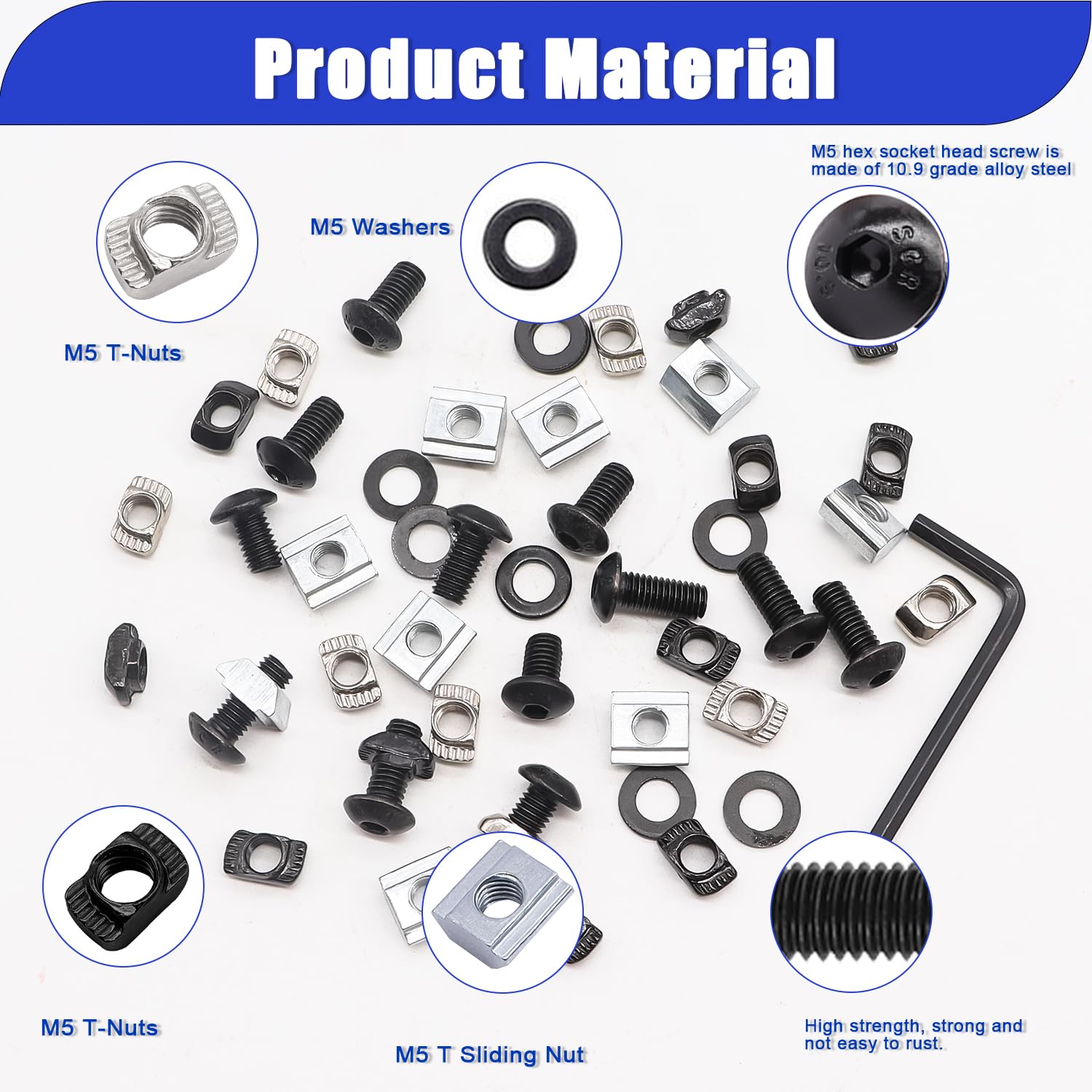 - Product material:M5 T-Nuts is nickel plated with carbon steel.M5 hex socket head screw is made of 10.9 grade alloy steel, which has high strength, firmness and is not easy to rust.