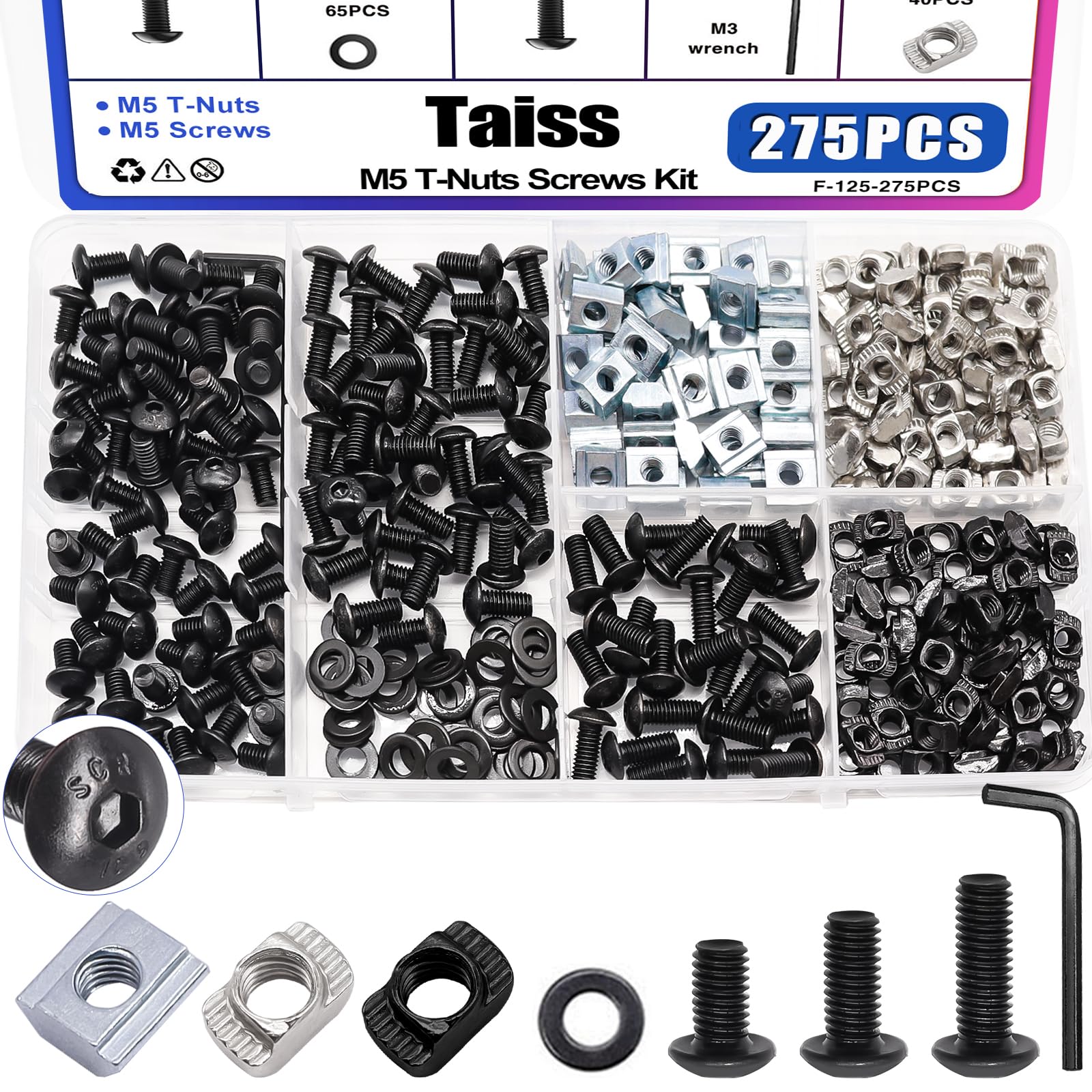 Taiss 275PCS M5 T-Nuts Screws Assortment Kit for 2020 Series Aluminum Extrusion,T Sliding Nut,Button Head Socket Cap Head Bolts and Nut & Washers for Mlok Screws and Nuts Replacement with Wrench
