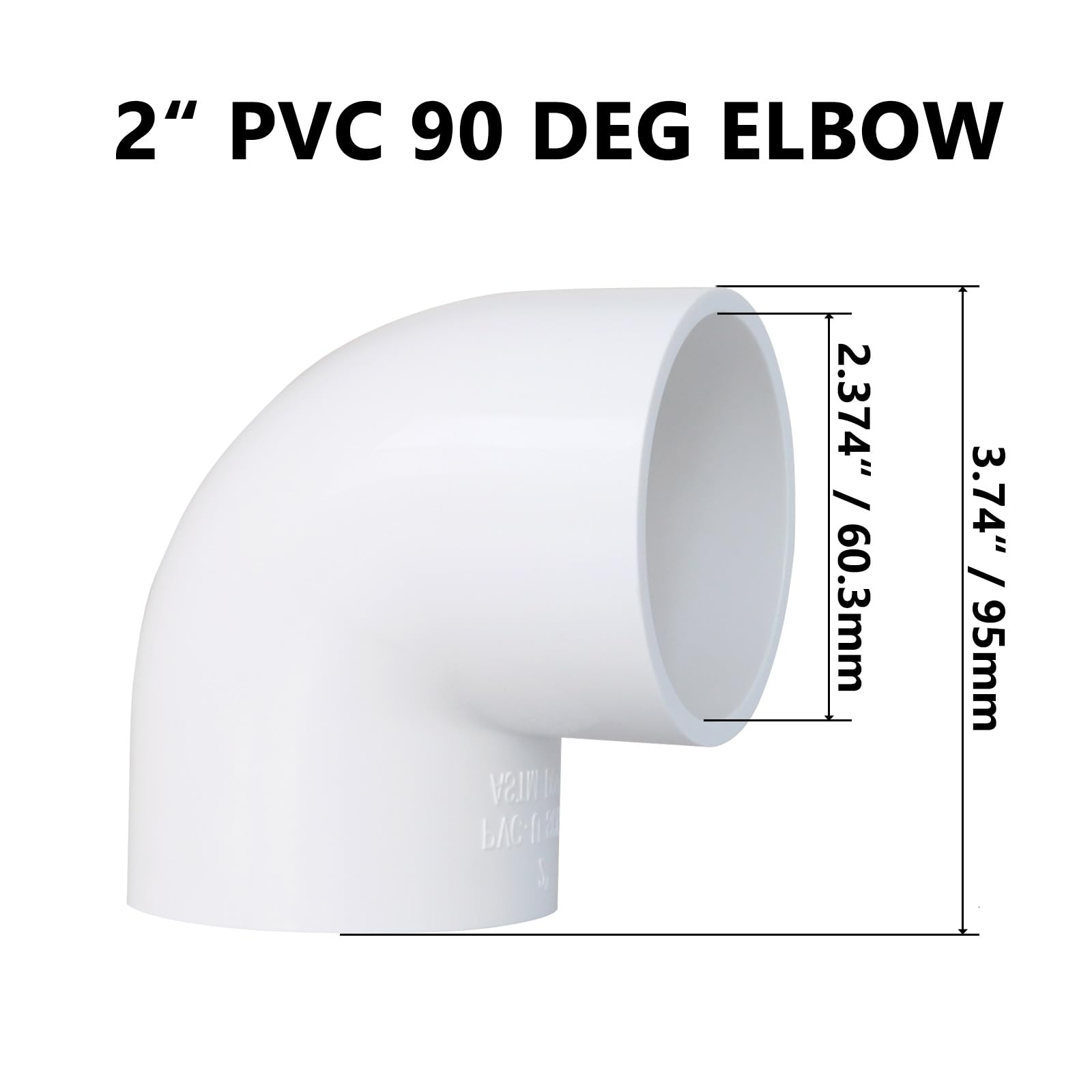 - 2 inch PVC PIPE ELBOW: The PVC pipe fitting fits 2" inside diameter / 2.374" outside diameter PVC pipe. 90 degree right angle fitting connectors are ideal for edge, corner and center connections. Socket openings on both ends for connecting two male pipes.