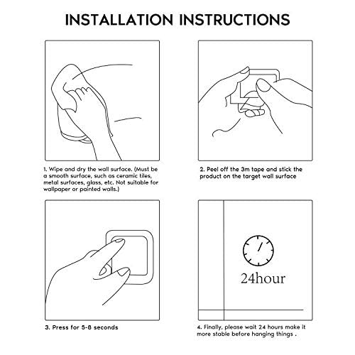 - Installation without drillings: Robe hooks for bathrooms are easy to install, no drilling, no screws, no holes. Just tear off the protective layer on the back and paste it in the desired position. The wall should be kept dry and clean during installation. It would be better to wait for 24 hours before hanging the items.