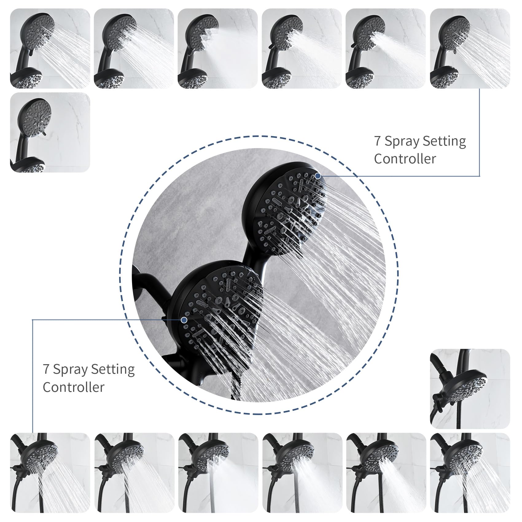 - 🥇【Matte Black Shower Fixtures】Simple and stylish black shower faucet set complete designed with 7-setting overhead shower head and handheld shower, which can be used separately or simultaneously. High-output tub spout can fill your bathtub in a matter of minutes