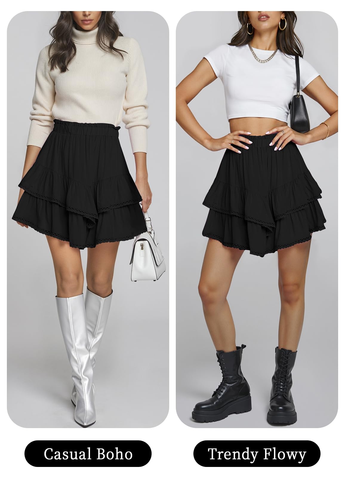 - DESIGN: The flowy preppy shorts Double layer Ruffle Tiered Design with a stretchy, elastic waistband for a comfortable, secure fit that easily adapts to different body shapes. The skirt includes built-in shorts, offering the perfect blend of style and functionality. You can move freely and confidently, knowing you have coverage while still enjoying the look of a skirt
