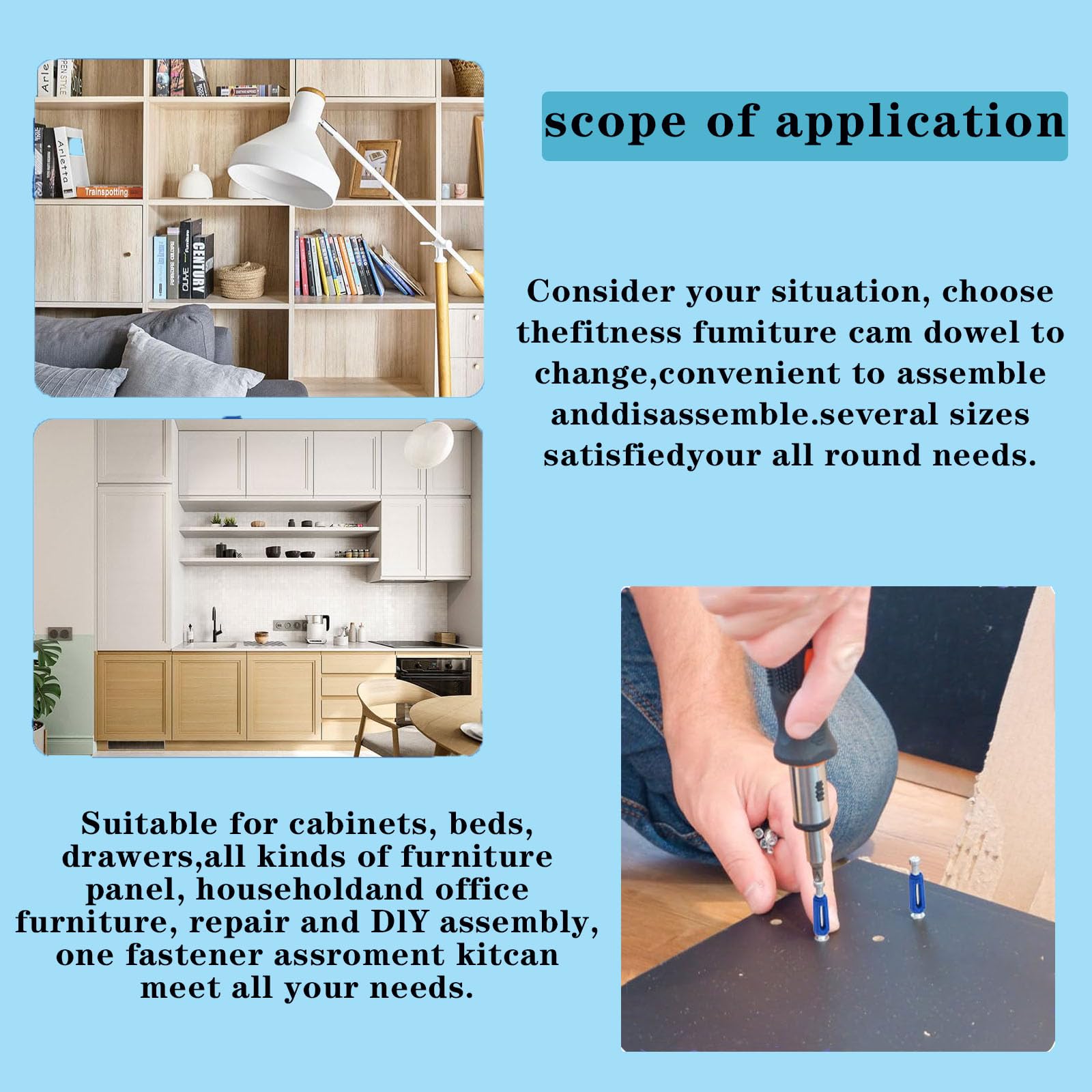 - Multipurpose Application: furniture cam lock fasteners are widely used,suitable for most furniture attachments, for example drawers, cabinets, dressers,desks, tables, bookshelves,chairs and DIY projects etc.