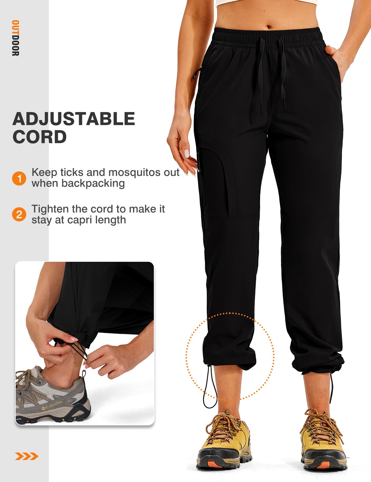 - Adjustable Cord: These cargo pants feature adjustable cord lock around the cuffs to keep ticks and mosquitos out when backpacking, also you can tighten the cord to make it stay at capri length for river tracing
