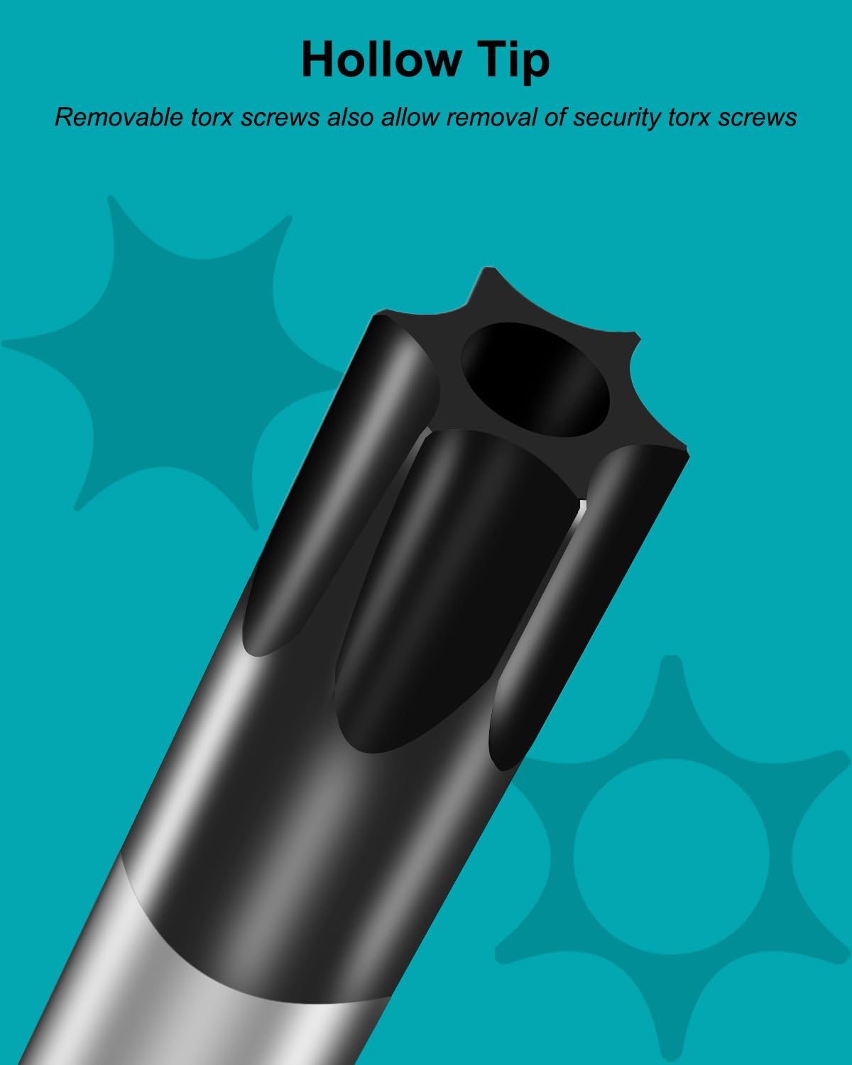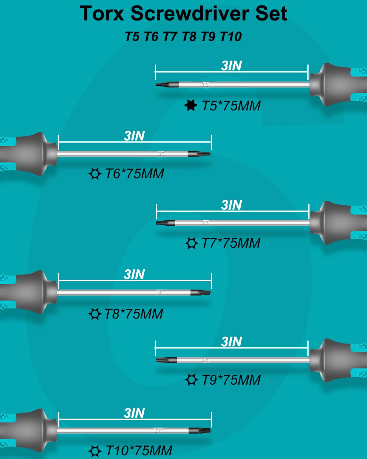 - 【Torx Screwdriver Set】6-piece star screwdriver set with T5 solid tip, T6H, T7H, T8H, T9H, T10H hollow tip screwdrivers, primarily for torx and security torx repairs.