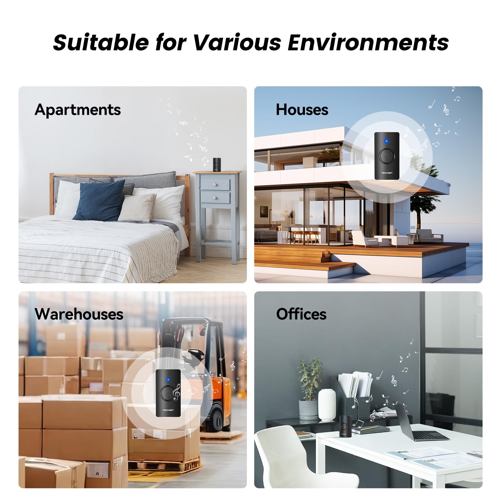 - 【🔋 Battery-Powered for Ultimate Portability & Flexibility】Say goodbye to power outlets! As a fully battery-operated wireless doorbell, it offers true installation freedom. Place the receiver on your desk, carry it to the garden, or move it anywhere needed. This makes it the perfect plug-in doorbell alternative for renters and multi-purpose use.