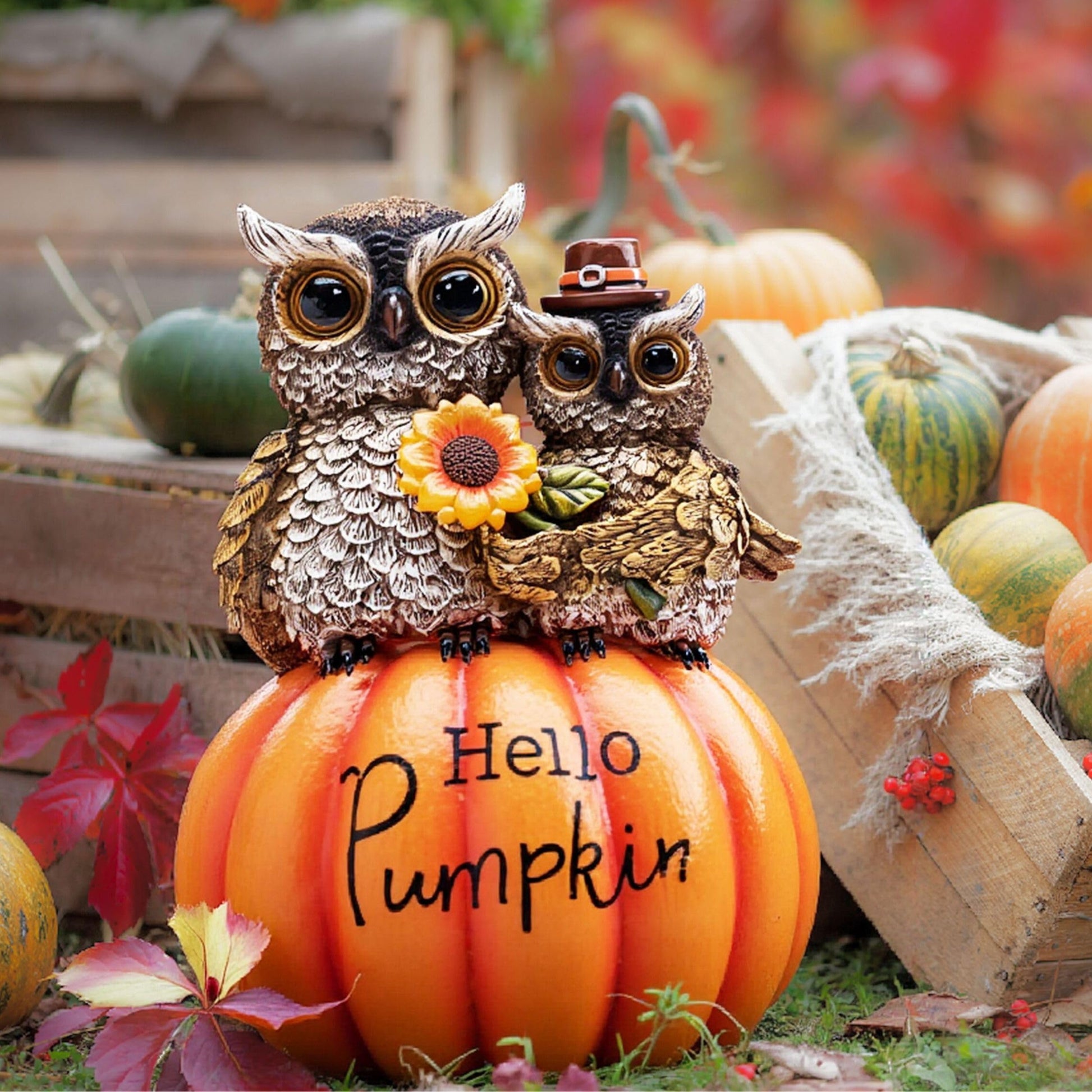 - 【Original Design】 This charming resin garden decoration captures the essence of the Harvest Festival with a pair of owls — a small one cradling a sunflower and a larger one standing by its side. Together, they perch gracefully on a pumpkin inscribed with "hello pumpkin," adding a whimsical touch to any outdoor space.