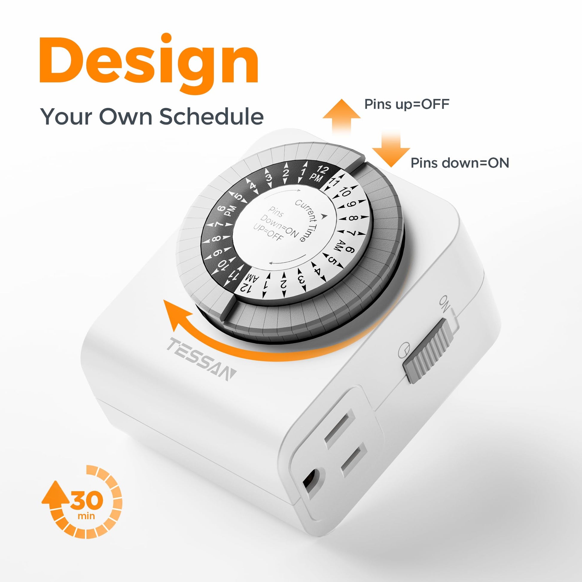 - Daily Recurring Timer:TESSAN outlet timer with 48 programmable ON/OFF settings within a 24-hour cycle, each pin represents a 30-minute interval, repeating your schedule daily for routine management with light timers for lamps indoor