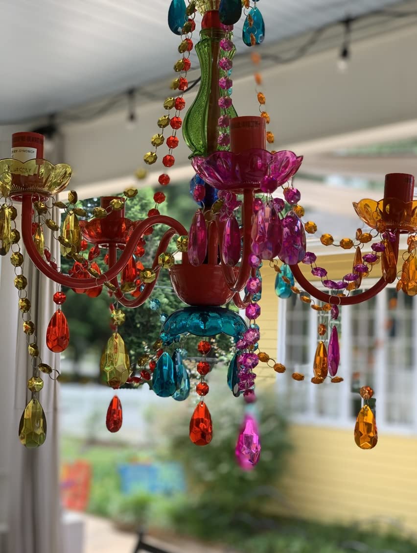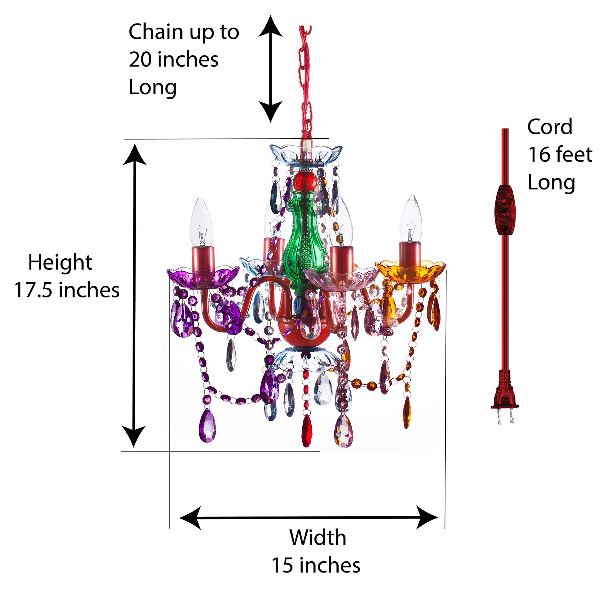 The Original Brink House Plug-in 4 Light Multicolor Hanging Swag Chandelier H17.5”xW15”, Red Metal Frame with Multicolor Glass Stem and Acrylic Crystals