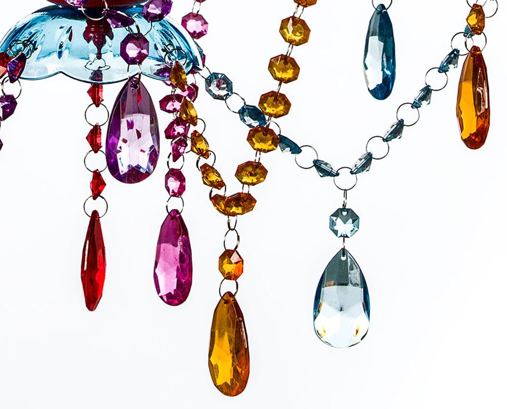 - Strong and light weight - high quality thick and faceted acrylic crystals. We use poly-carbonate crystals which is the same material used in bullet proof windows and eye lenses, very light and strong. Glass scratches and breaks easily, needs to be assembled one piece at a time, is heavy and costly. Our poly-carbonate acrylic crystals will reflect and refract light similar to glass, comes in many different colors and arrives fully assembled.