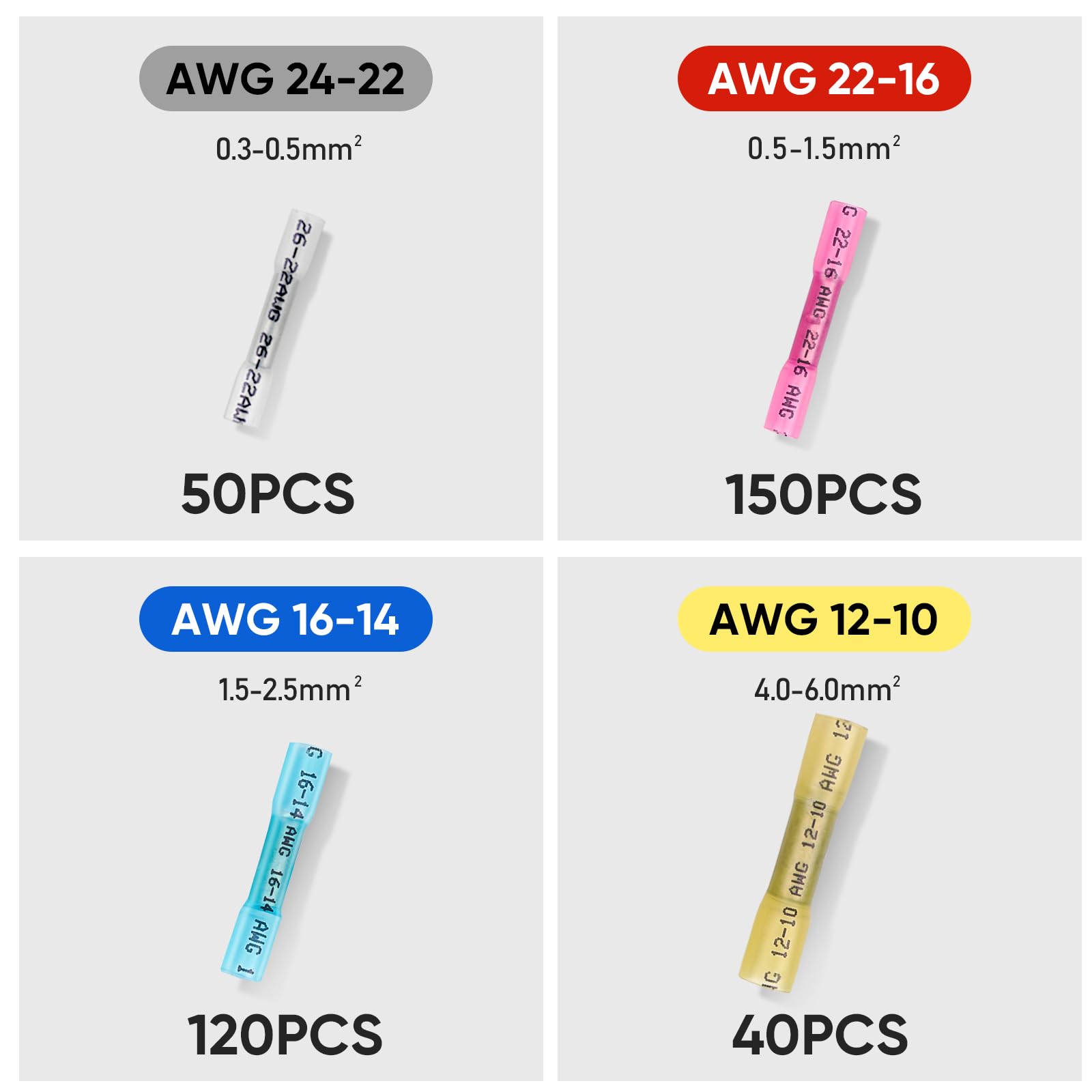 - [WIDE APPLICATIONS] Compliant with all electrical standards, Perfect for marine and automobile applications, whether you are working on your boat, Vehicle, Home or scientific project, our electrical crimp connector will ensure strong watertight seal to make sure everything bond correctly. The connector assortment includes white (AWG 24 – 22), red (AWG 22 – 16), blue (AWG 16 – 14) and yellow (AWG 12 – 10) butt connectors that can be used on wire AWG from 24 to 10