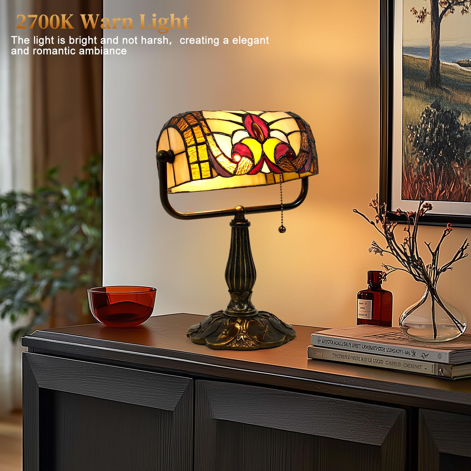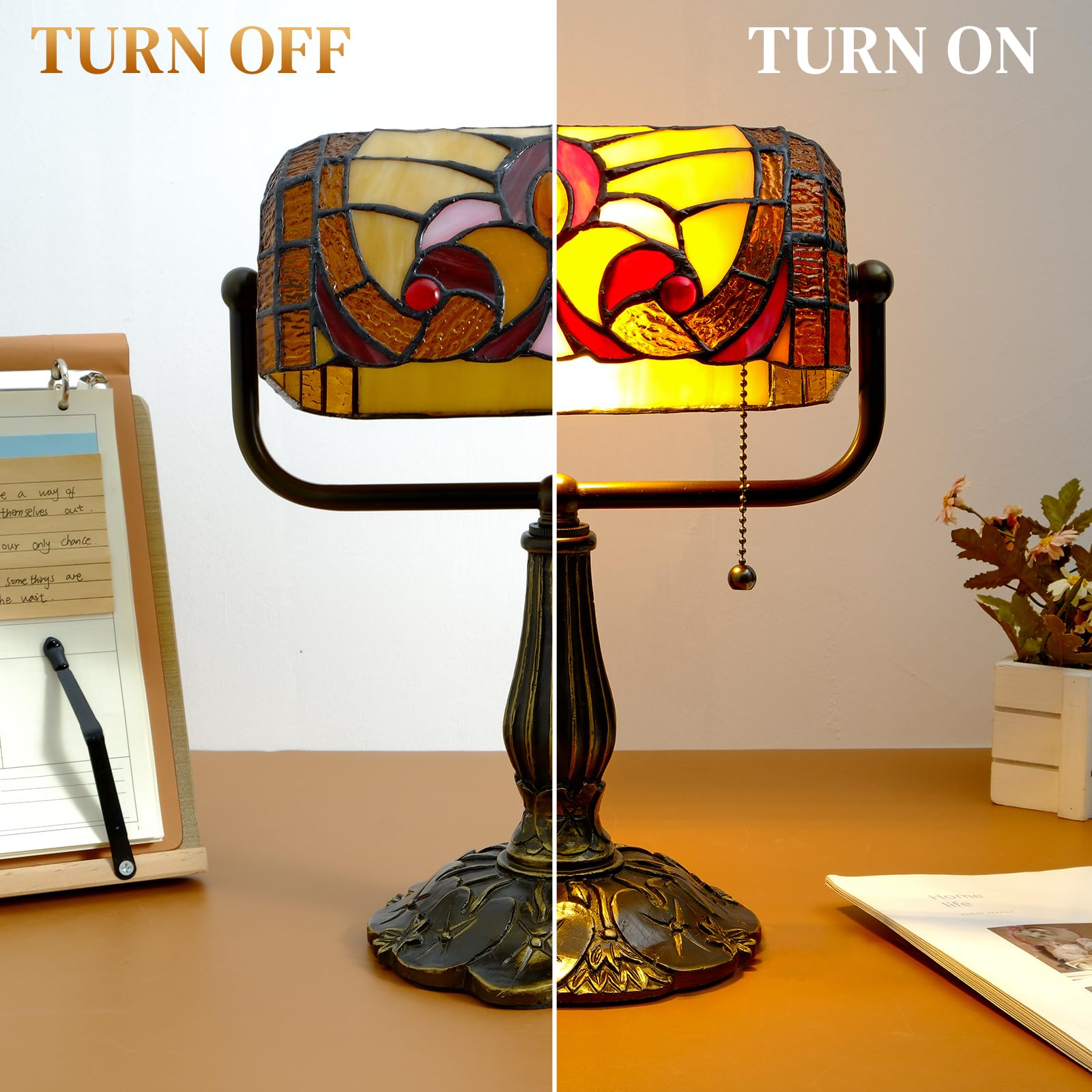 - Bank Lamp with Pull Chain Switch - The banker lamp features an easy-to-use pull-chain switch for effortless operation, maintaining its classic bankers lamp authenticity. With compact dimensions (10.5"L x 4.5"W x 12"H), Shade Dimensions: 9"Lx 4.5"Wx 4"H, this Tiffany-style table lamp fits any space. Ideal as a desk lamp, decorative accent, or gift-ready centerpiece