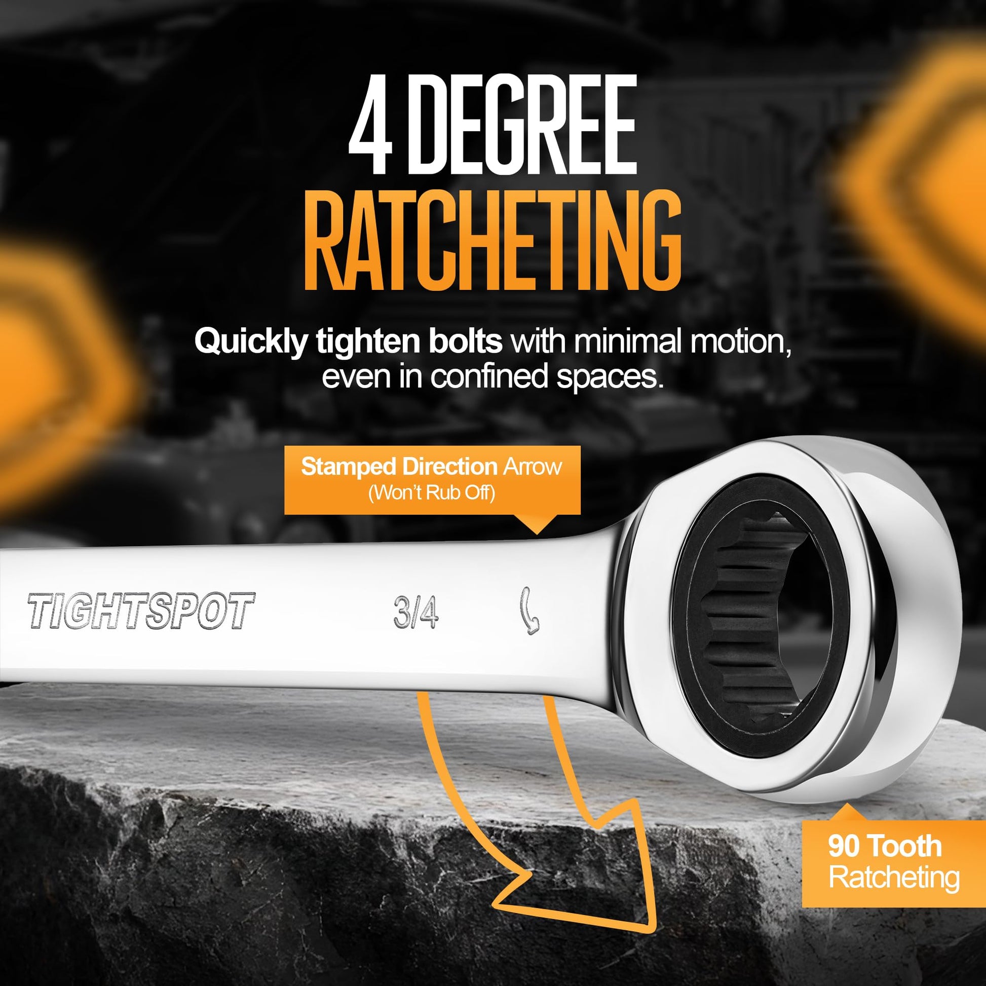 - Our ultimate TightSpot wrench to work faster in small spaces: Our incredibly priced, 4 degree ratcheting movement is designed to access spots where standard wrenches will not have enough swing. The 90 teeth inside the 100% steel ratcheting box end will speeds you through jobs quickly with no need to lift. And without lifting, you stay glued to the fastener until the turning is done, even if you're reaching deep into a compartment or appliance.