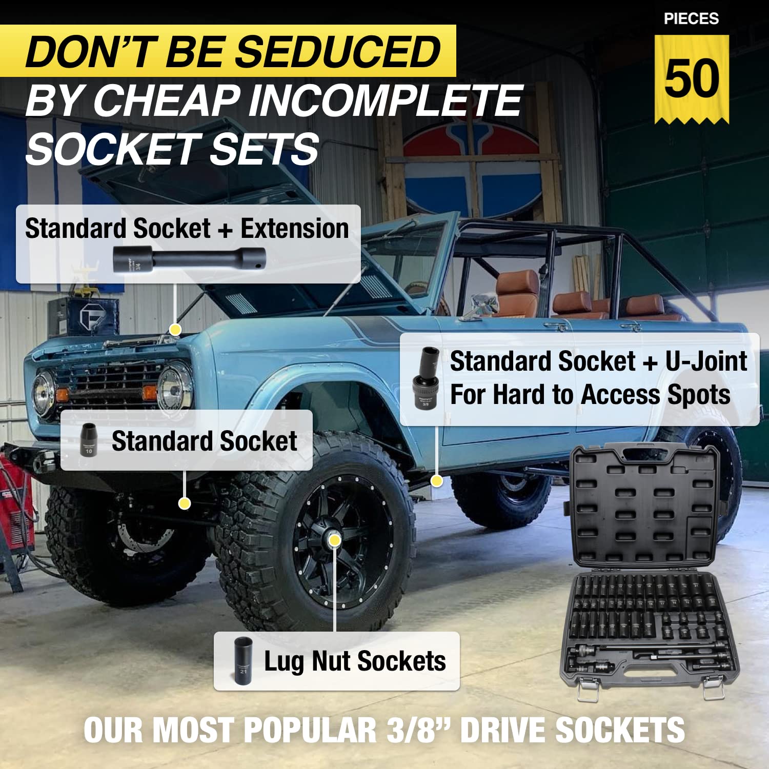 - [Pro Set]: Our Pro Set has every popular 3/8" drive socket we have! 50 pieces of every socket, extension, and U-Joint we use every day. Too many to list here, see Product Description below for a list!