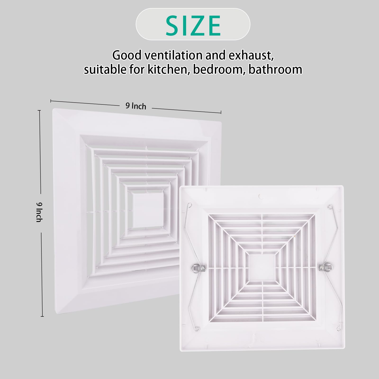 - 【Perfect Comfortable Fit in the Bathroom】: Our bathroom fan cover 1 sets are suitable for many at home bathrooms or accessories. The dimensions are 9" x 9" with a 7" spacing between the spring clips Recognize the comfortable fit of most bathtub fans as standard. We recommend that you check before you buy Check the size of your ventilator grille to confirm compatibility with your fan exhaust pipe.
