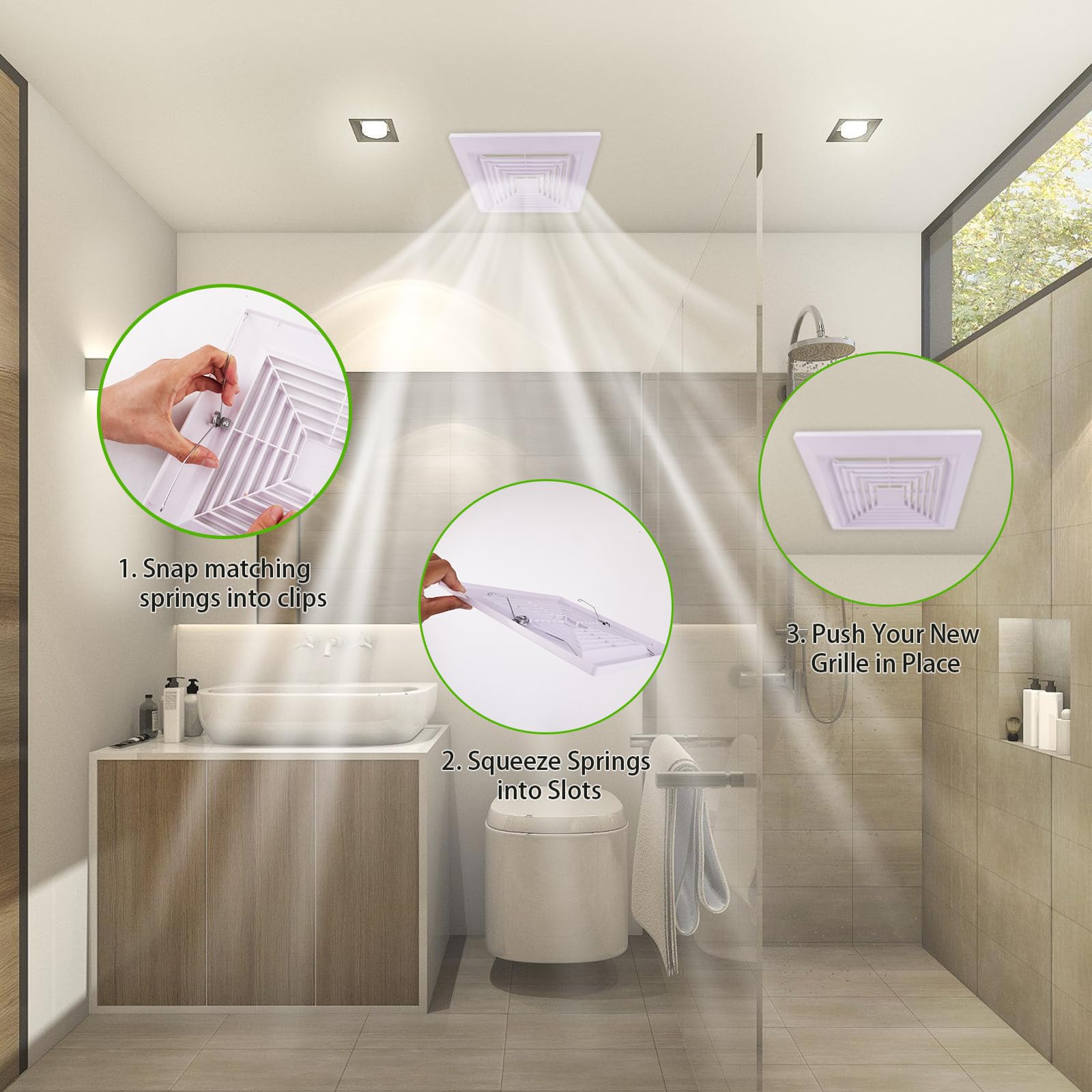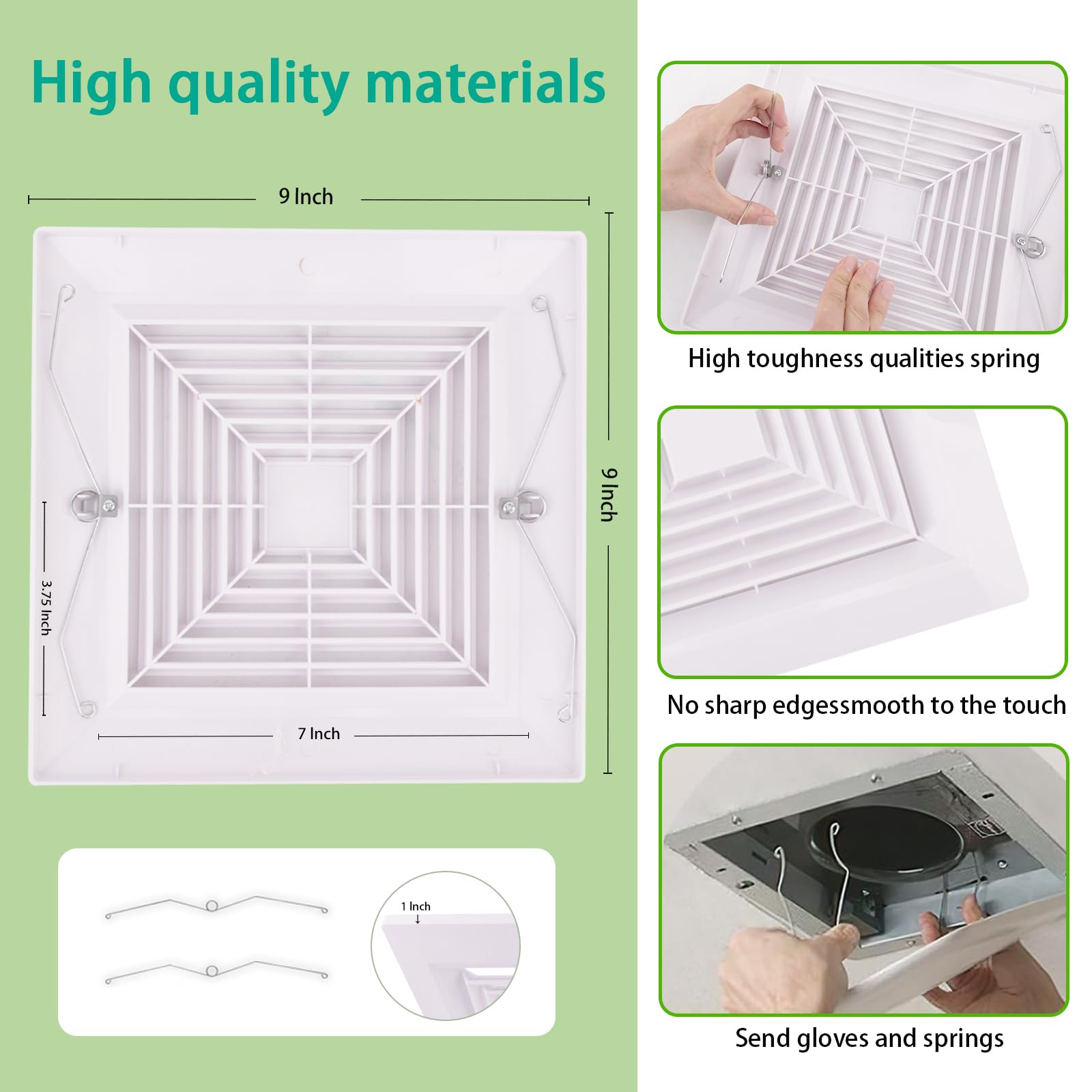- (Easy and simple installation process) : The bathroom ventilation fan cover includes one for fixing on the back springs, you can install them yourself without professional help. The feature is that the installation is simple, no Any tools are required. Consists of a set of additional elongated springs to meet a wider range of requirements Installation requirements.