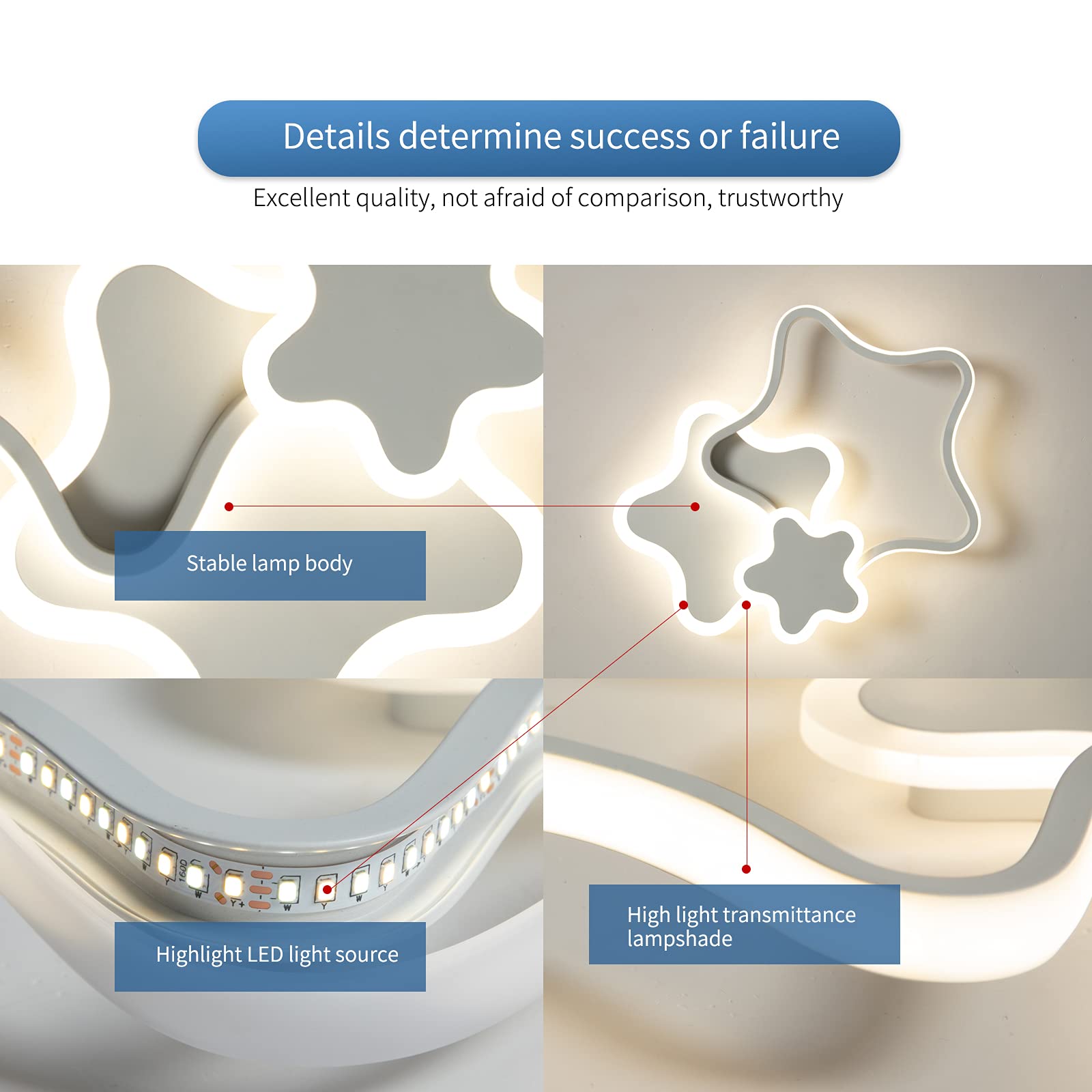 - High-quality Bedroom Ceiling Light: This white cloud-shaped ceiling light fixture is made of high quality hardware materials(Iron, Aluminum, Acrylic), durable and long-time use. Come with user manual and all mounting hardware(Remote Control Included). Install this adorable star ceiling light to boys/girls room to enjoy the light up!