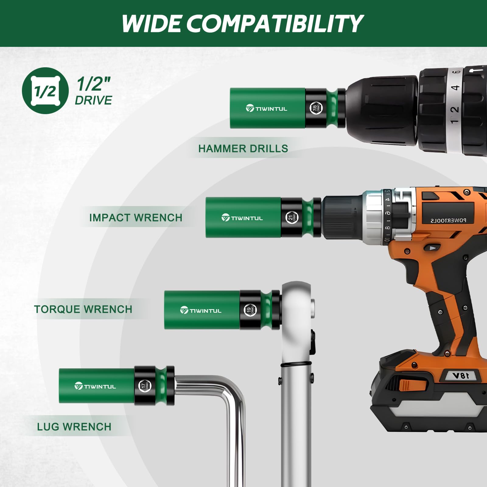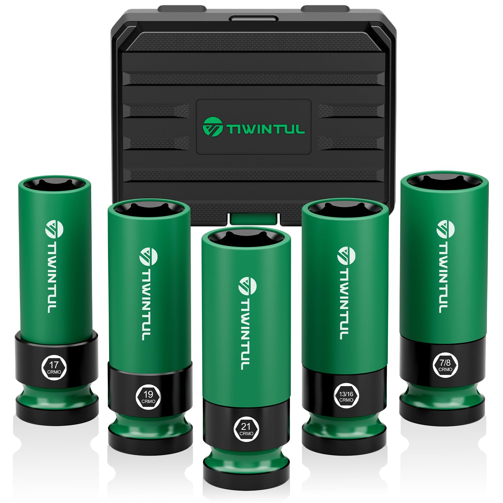 TIWINTUL 1/2" Wheel Protector Impact Socket Set, 5Pcs Non-Marring Lug Nut Socket Set, CR-MO Steel, 6-Point Thin Wall Deep Socket Set, Color-Coded Protective Sleeves- Metric 17 19 21 mm, SAE 13/16 7/8"