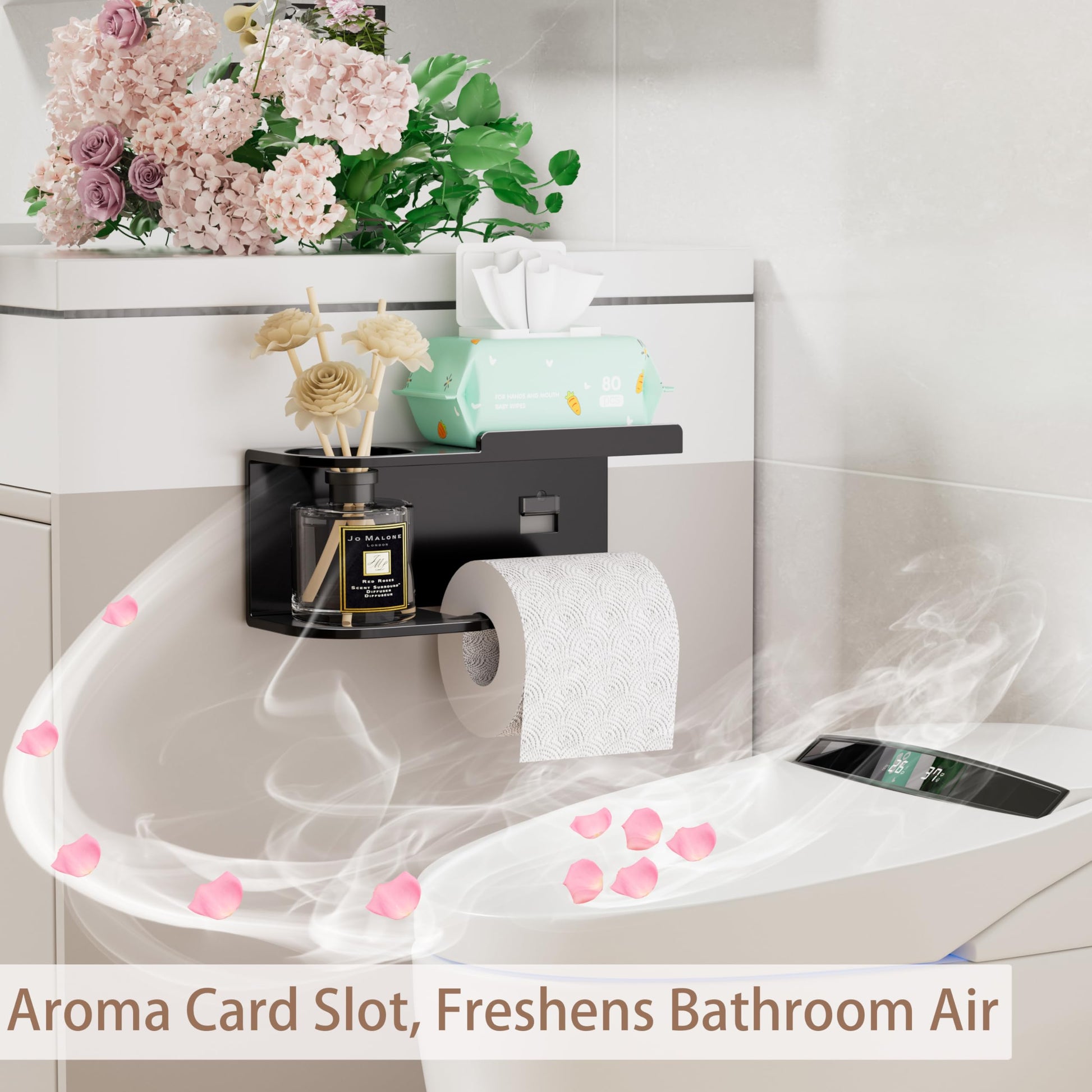 Toilet Paper Holder Wall Mount - Strong Adhesive or Screw Mount Bathroom Toilet Paper Holder with Shelf- SUS304 Stainless Steel Tissue Roll Storage - Holds Phone, Reed Diffuser(Matte Black)