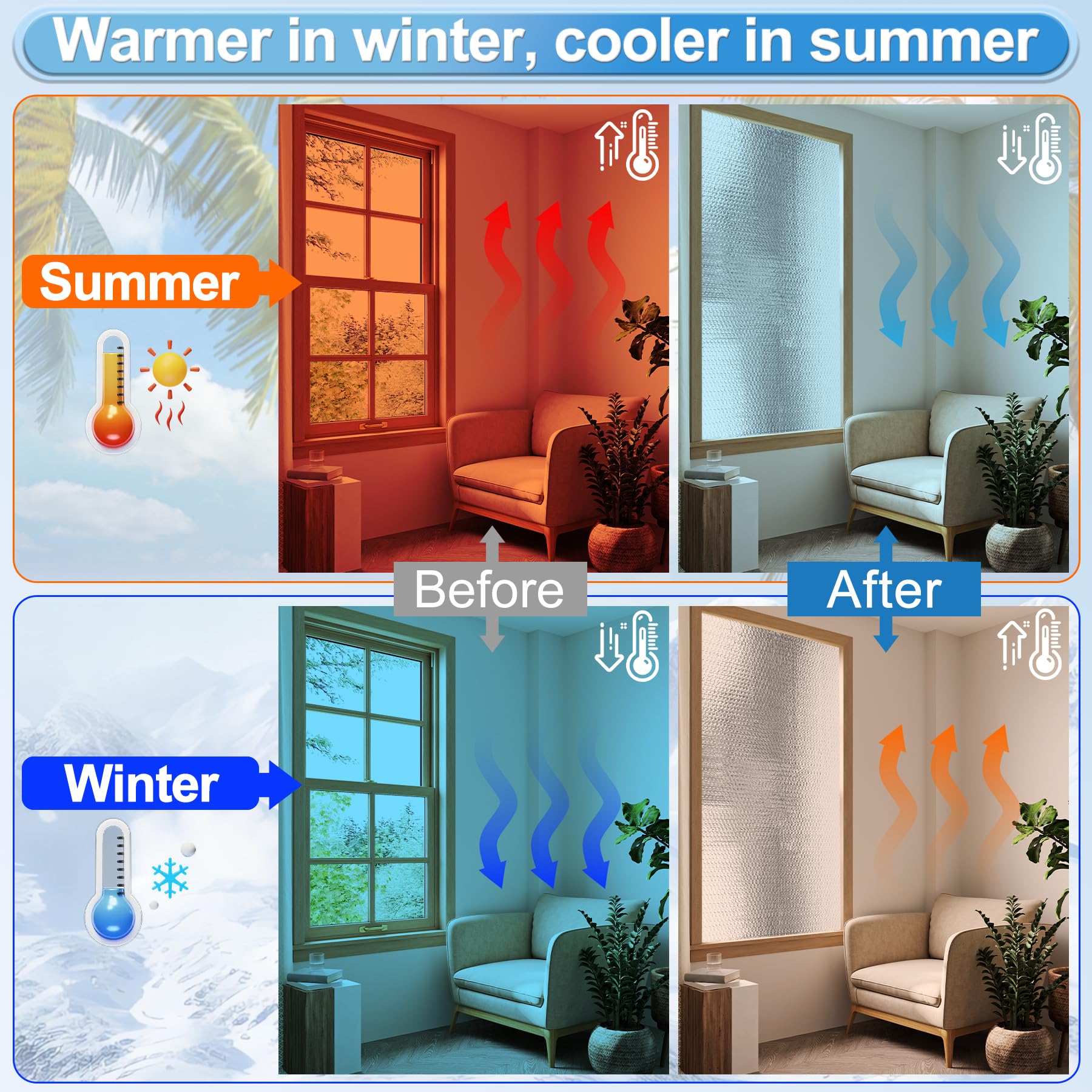 - 【Insulation Materials】Reflective insulation roll is made of premium reflective aluminized film and PE bubble wrap. The thickness is 3 mm, and most others are only 2 mm thick. Designed for better thermal insulation. Window insulation sheet is odorless, tear and aging resistant. Can block sunlight and avoid sunlight aging, decorate your home