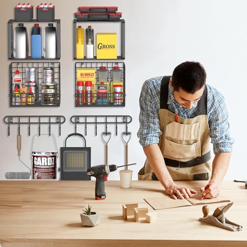 - [AMPLE STORAGE CAPACITY] - The package includes: 2¡¿Shelves, 2¡¿Wire Baskets, 2¡¿Hook Racks. This unique storage combination has a large enough capacity to store a lot of garage supplies. Utilize the capacity of these shelves to make your home look cleaner and neater.