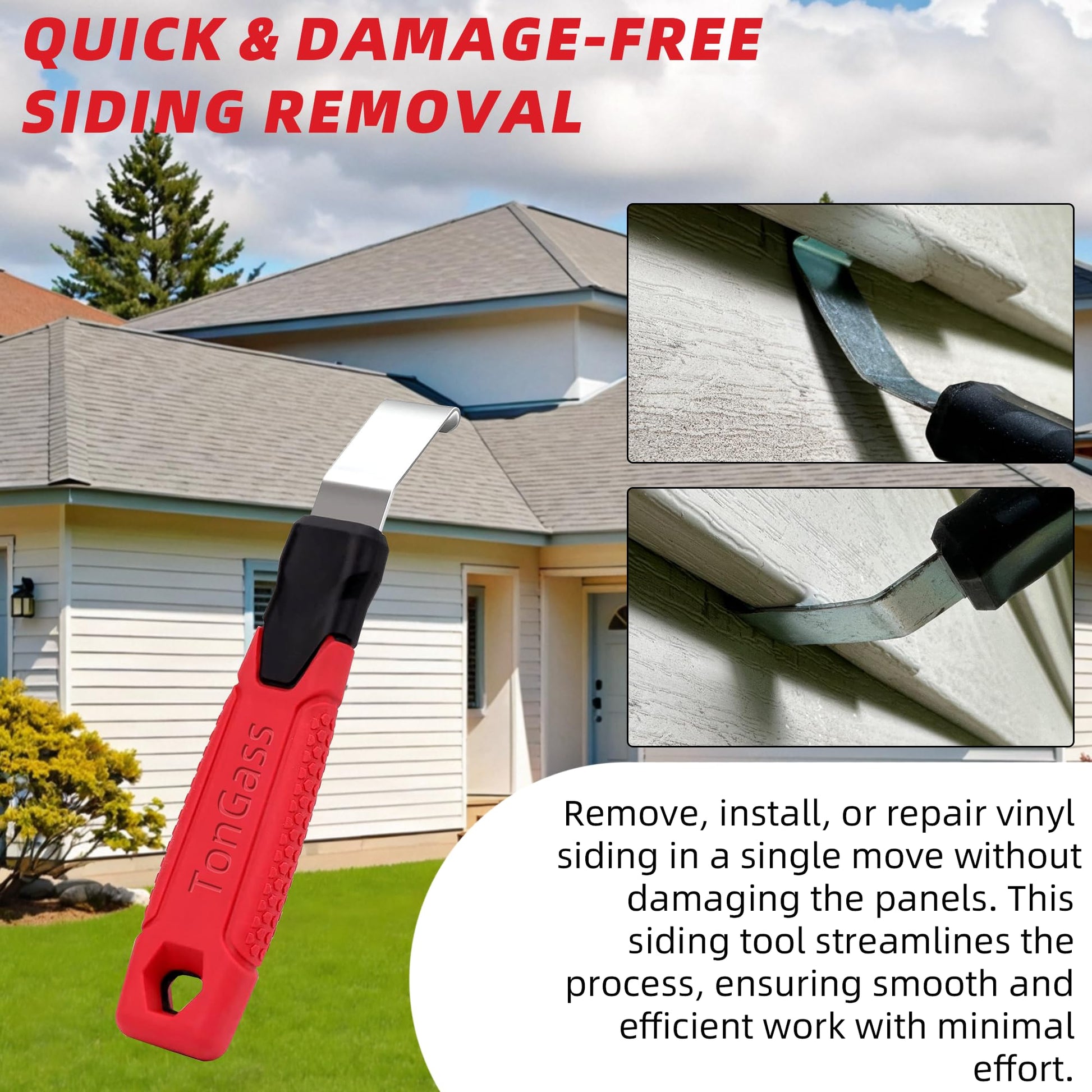 - Quick & Damage-Free Siding Removal – Remove, install, or repair vinyl siding in a single move without damaging the panels. This siding tool streamlines the process, ensuring smooth and efficient work with minimal effort.