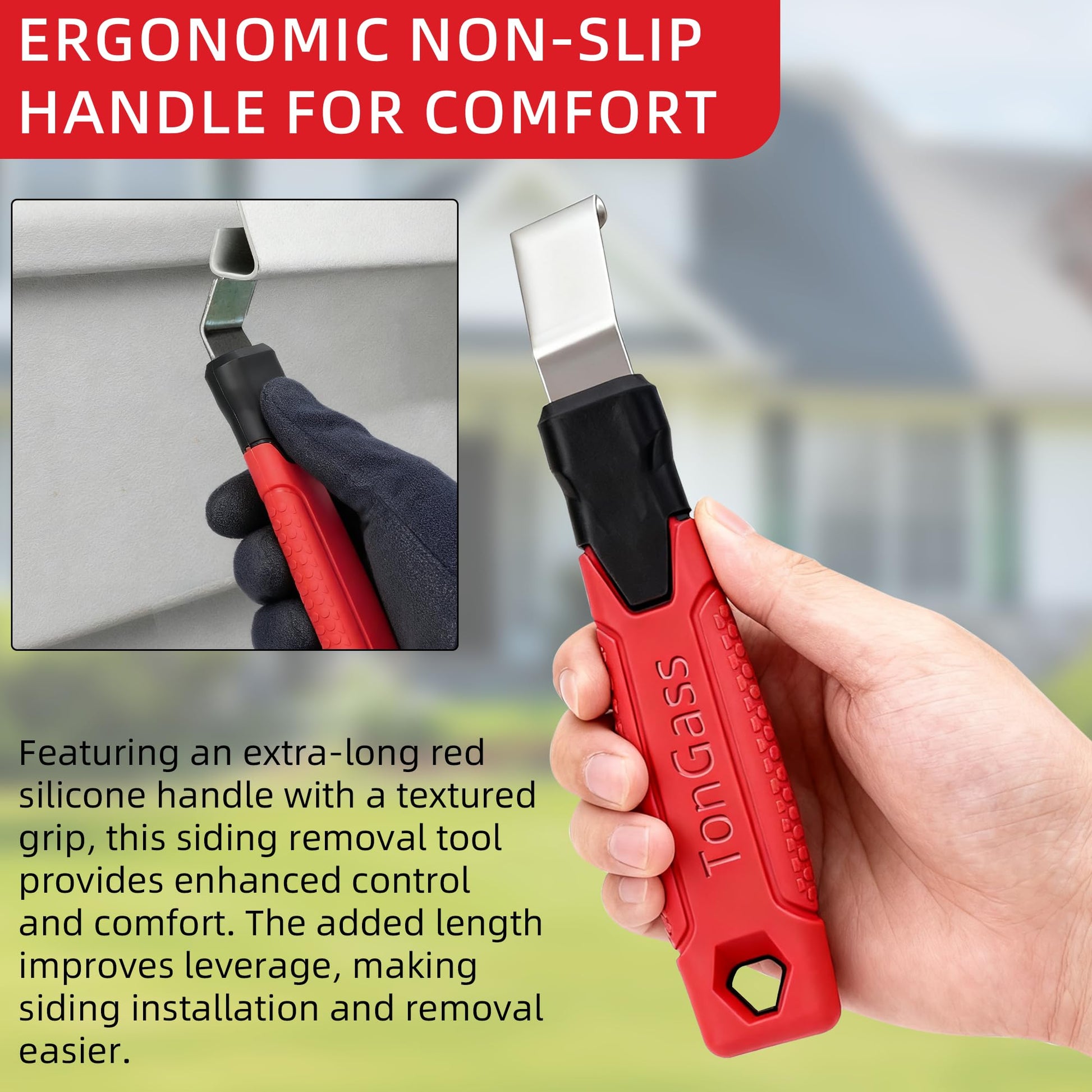 - Ergonomic Non-Slip Handle for Comfort – Featuring an extra-long red silicone handle with a textured grip, this siding removal tool provides enhanced control and comfort. The added length improves leverage, making siding installation and removal easier.