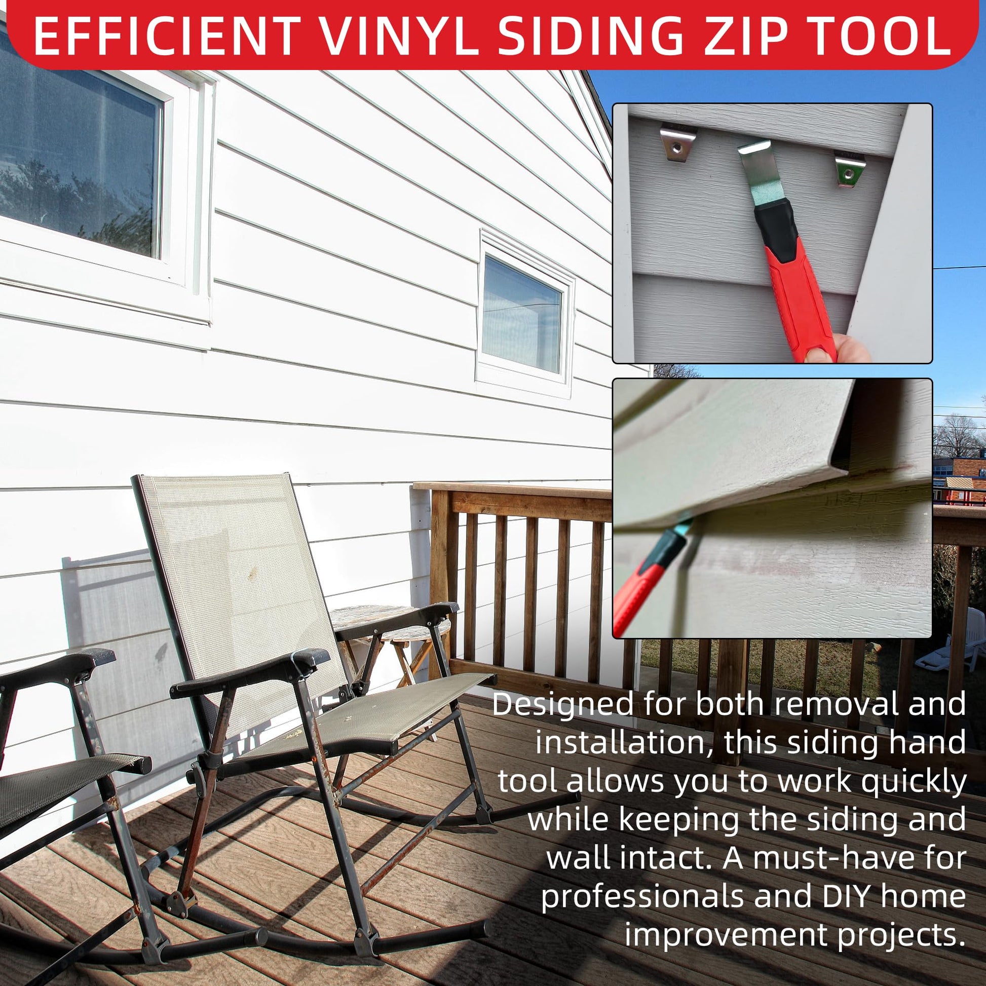 - Efficient Vinyl Siding Zip Tool – Designed for both removal and installation, this siding hand tool allows you to work quickly while keeping the siding and wall intact. A must-have for professionals and DIY home improvement projects.