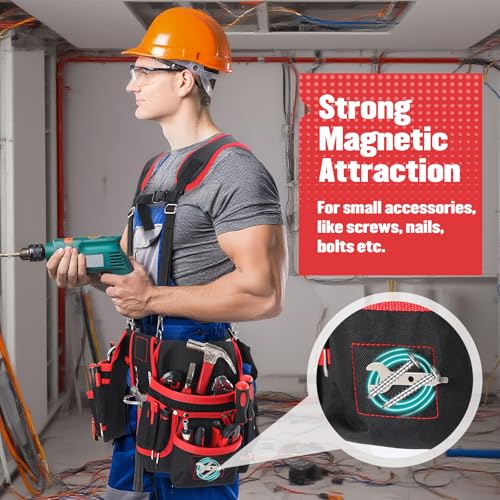 Tool Belt, Professional Tool Belts with Suspenders, Magnetic Tool Pouch for Men, Heavy Duty Detachable Adjustable Work Belt for Electrician, Carpenter, Construction