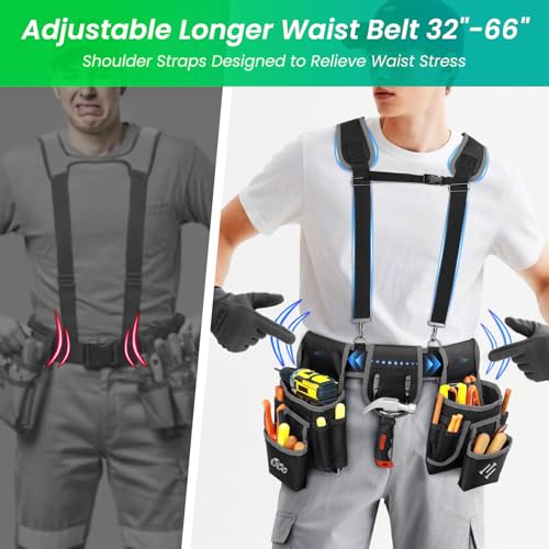 - Heavy Duty Tool Belt: Crafted from premium oxford fabric with double-stitched seams, our carpenter tool belt is built to last. The upgraded, thickened and widened waistband offers comfort and strength, boosting load-bearing capacity. With tool belt suspenders, it eases back pressure and shoulder fatigue for all-day comfort