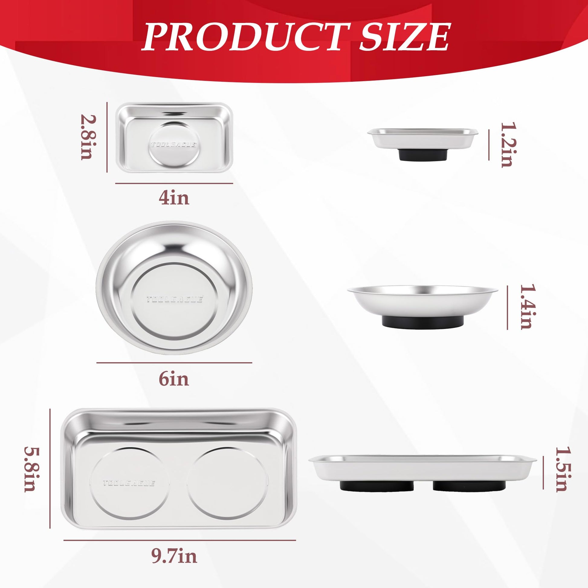 - What You Get:1pc 9.5"x5.8"x1.4" rectangular magnetic tray,2pcs 6" diameter round magnetic parts bowl,1pc 3.7"x2.5"x1" mini magnetic tray and 1pc 15Lb Magnetic Pickup Pen.