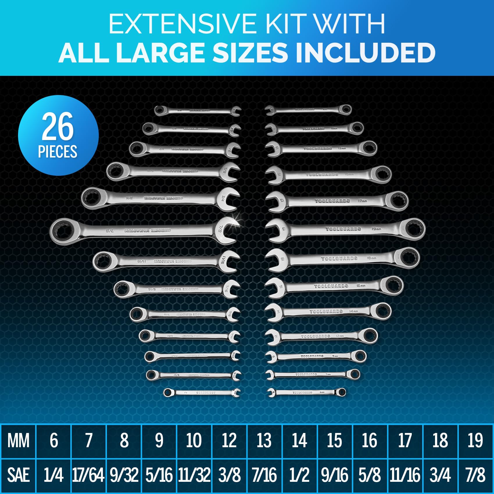 - ToolGuards 26 Ratcheting wrench set | This is an imperial and metric ratchet wrenches set, containing 13 SAE and 13 metric chrome vanadium steel wrenches and comes in 2 wrench racks.