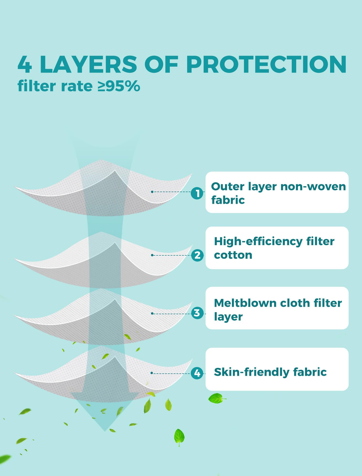 - 【Advanced Protection】The KN95 mask offers a 4-layer defense mechanism: an outer waterproof non-woven fabric that captures large particles, two melt-blown layers that filter more than 95% of fine particulates, and a soft hot air cotton layer that provides additional PM2.5 filtration.