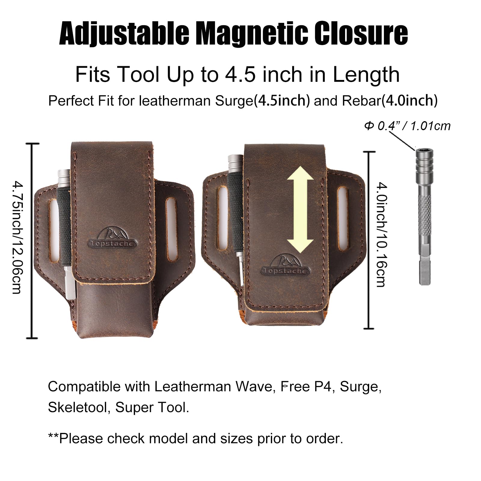 - Adjustable Inner Dimensions: Approximate internal dimensions 4.25"-4.75"(height) x 1.6" x 1". The main pocket accommodates Leatherman multitool up to 4" to 4.5" long and 1.6" wide, with a Leatherman bit kit. The open-ended elastic band on one side can fit a bit driver extender or slim EDC gear or pen with a pocket clip. It is a perfect leather multitool sheath to free up your messy pocket