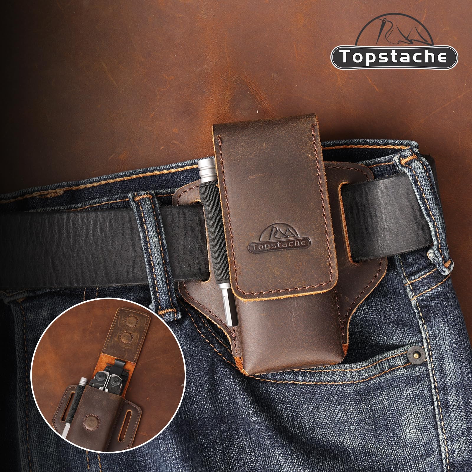 Topstache Leather Multitool Sheath for Belt - Multitool Holder - EDC Belt Organizer - Two Magnetic Closure - Darkbrown