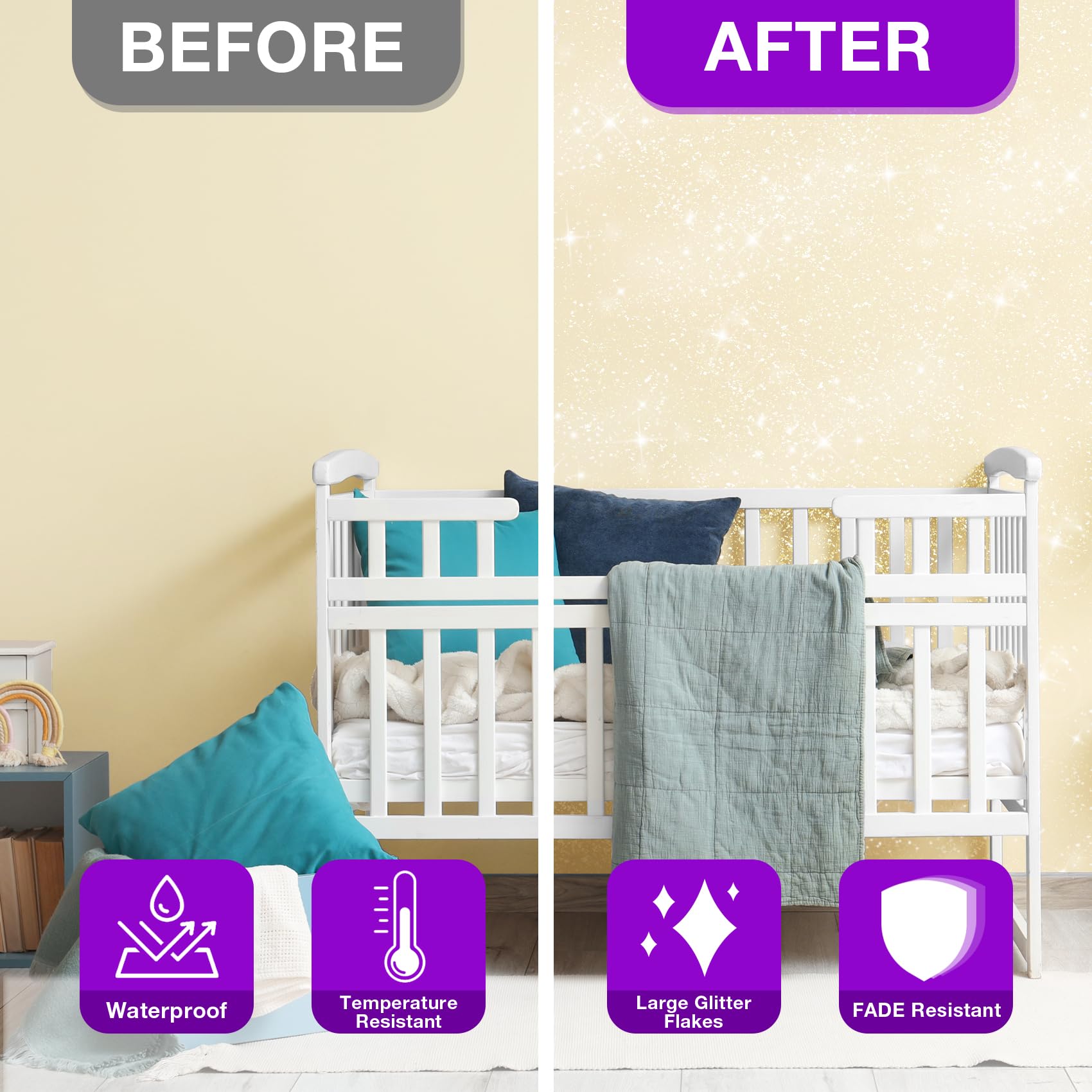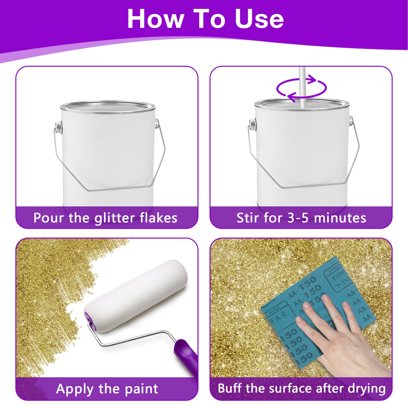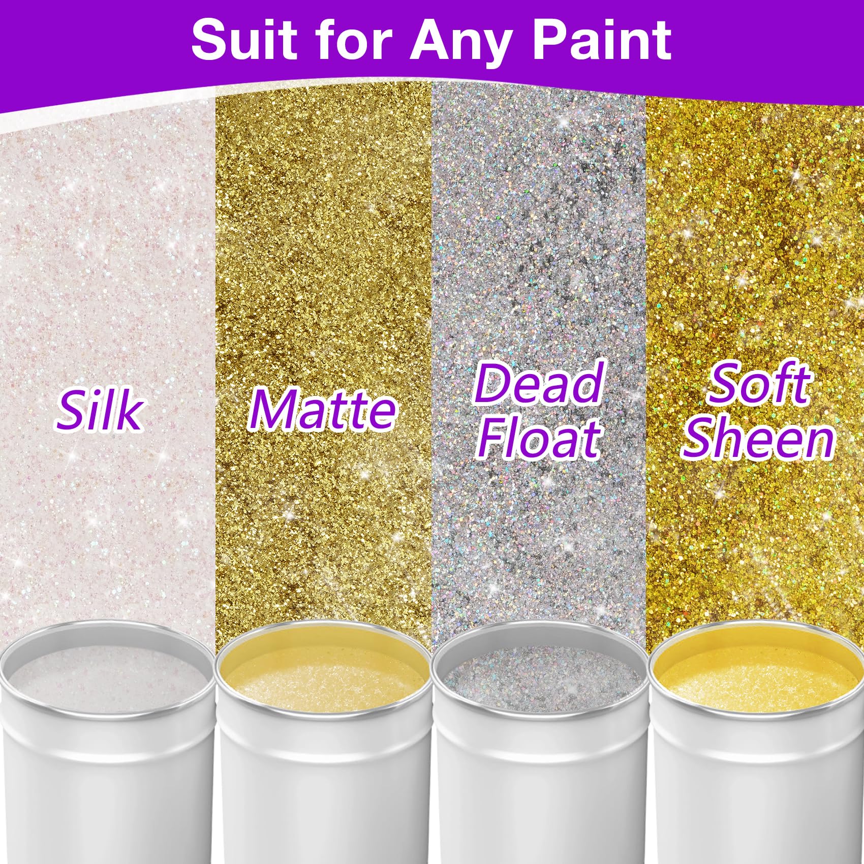 - Safe and Wide Applications: This non-toxic glitter for interior paint is ideal for all indoor spaces, perfect for glitter wall paint for bedrooms and living areas, also use this glitter paint additive in handmade crafts production or processing a variety of items for acrylic paints, interior exterior walls, wood, varnishes, furniture, fabric printing