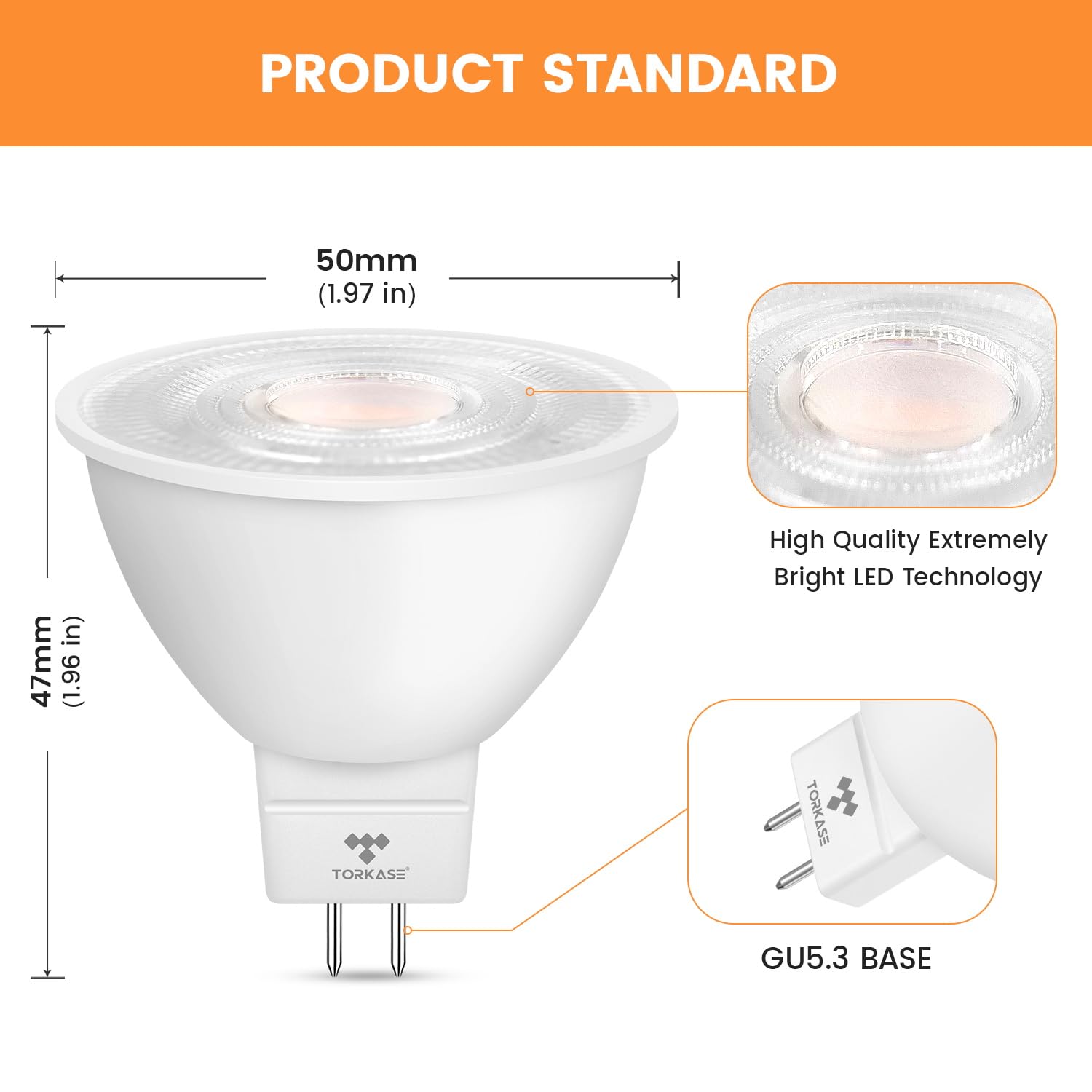 Torkase MR16 LED Bulbs Dimmable 6 Pack, 50W Halogen Equivalent, 5W GU5.3 12V Spotlight, 3000K Soft White, 500LM, 40° Beam Angle, UL Listed, Eye-Friendly, for Landscape, Recessed, and Track Lighting