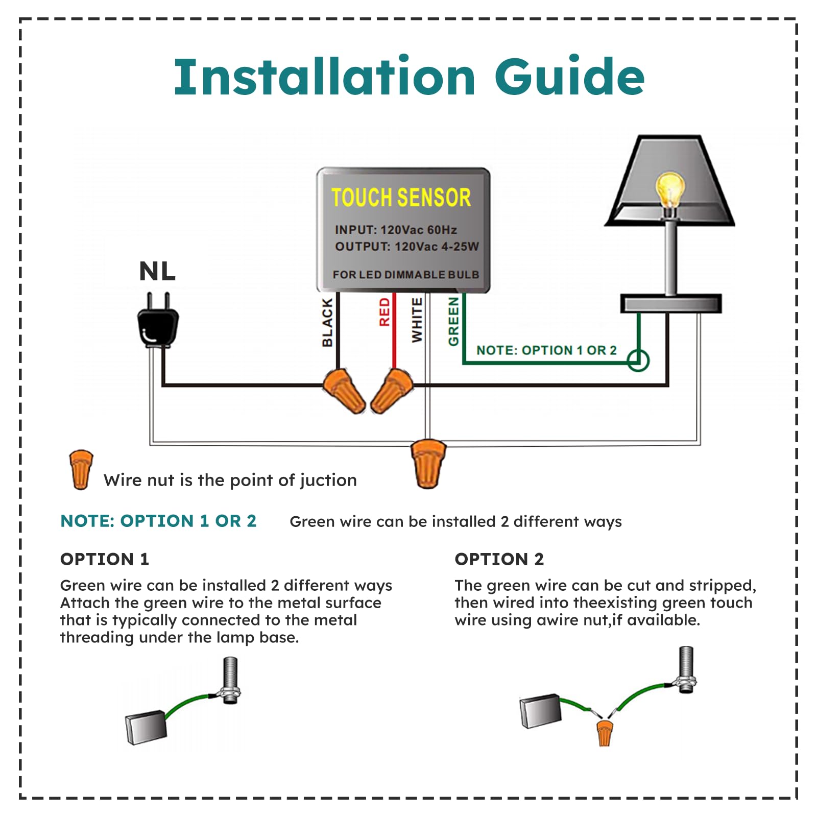 - Simple Installation Touch Lamp Module: Touch dimmer switch for lamp is easy to install. The wiring method for touch lamp replacement sensor is as follows: Green (T - Touch Wire): Attach to the metal components of the lamp. White (N - Neutral Wire): Connect the white wire to both the power wire and the neutral wire of the lamp. Red (R - Lamp Wire): Connect the red wire to the remaining wire of the lamp. Black (L - Live Wire): Connect the black wire to the remaining live wire from the power plug.