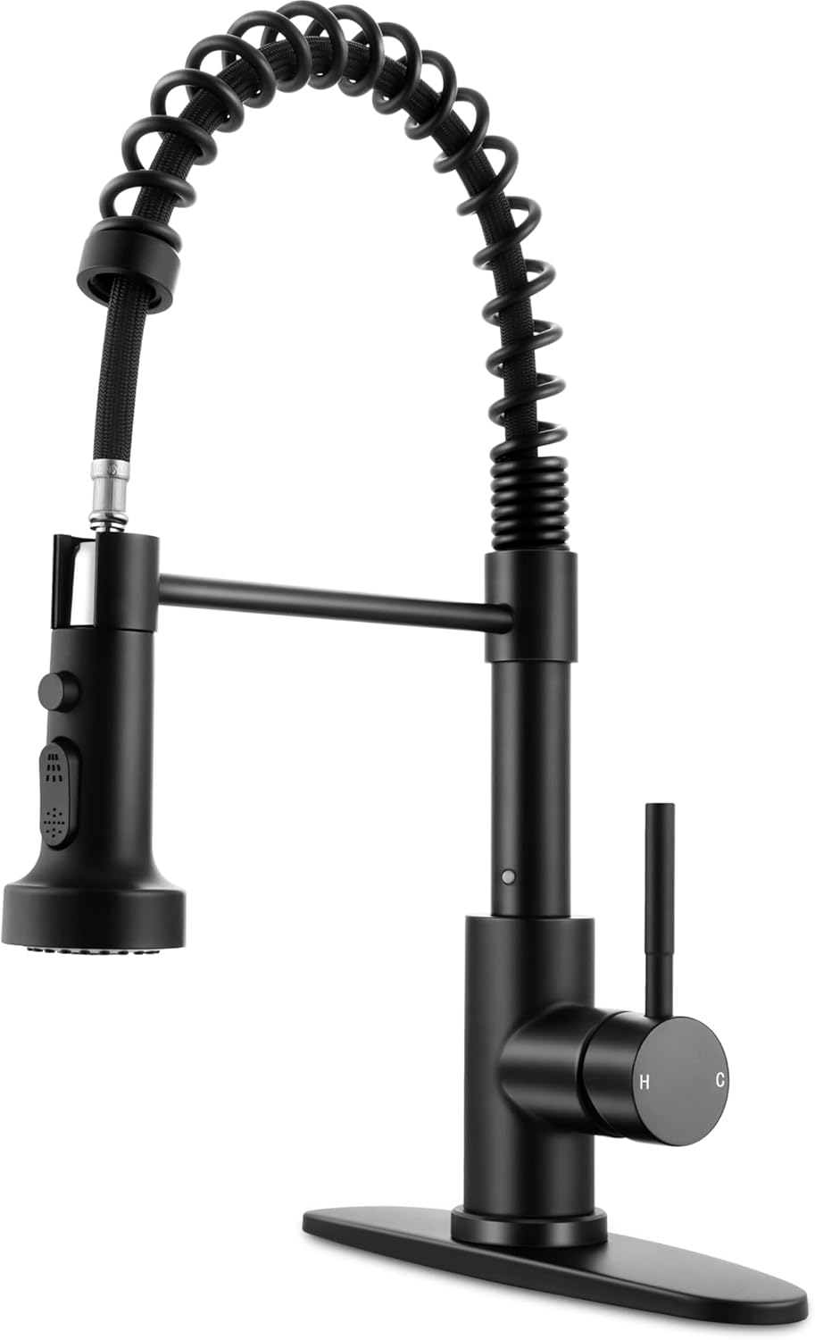 - Easy installation & Plus soap dispenser, the package includes a pre-assembled pull down kitchen faucet, deck plate, 16.9oz/500ml soap dispenser, and installation tools, overall height: 16.2", Spout Height: 4.6", 3/8" H & C water hoses length: 31.5”, long hoses match most cabinets, water use information: 1.7 gpm/min, 10” deck plate for 1 or 3-hole installation. You can follow the installation guide to install without a plumber, which may take you 30 minutes