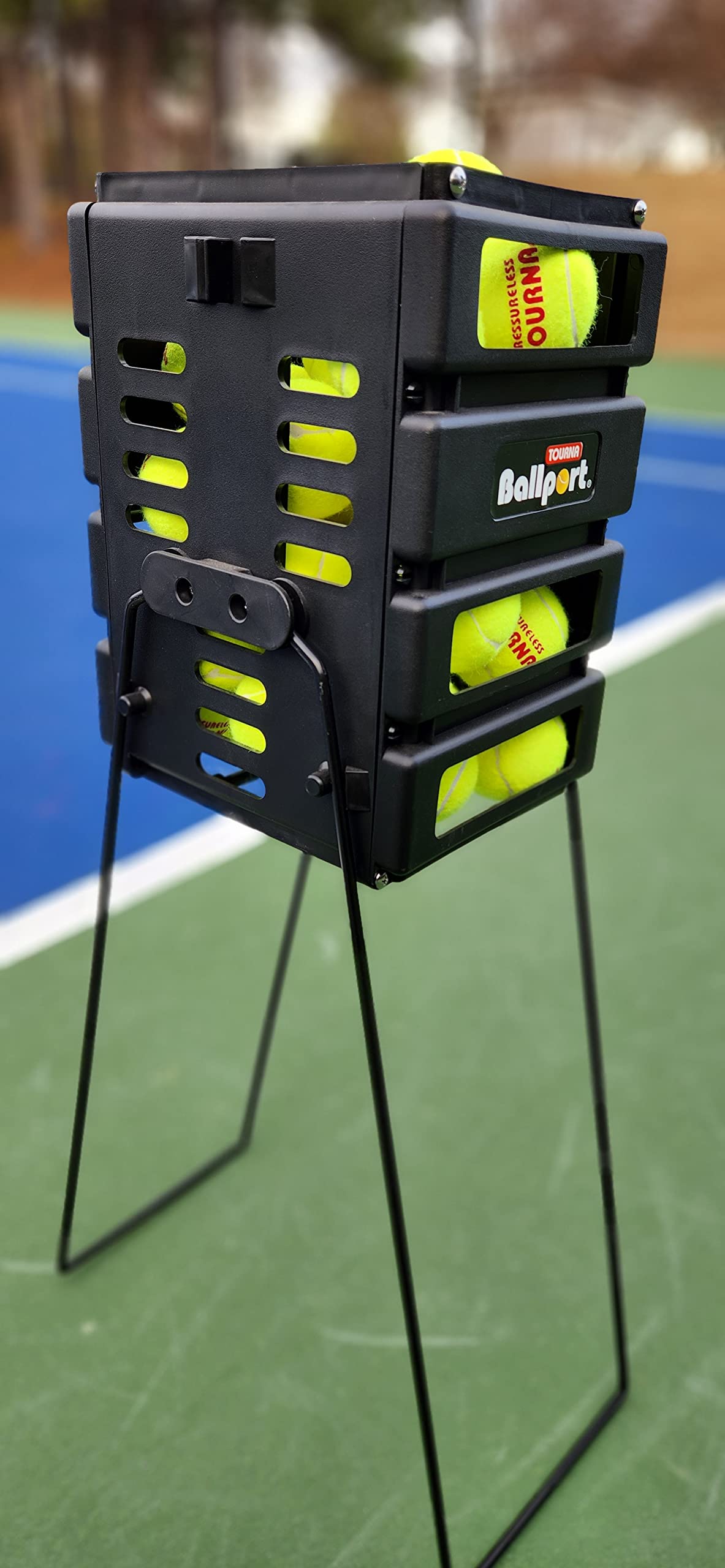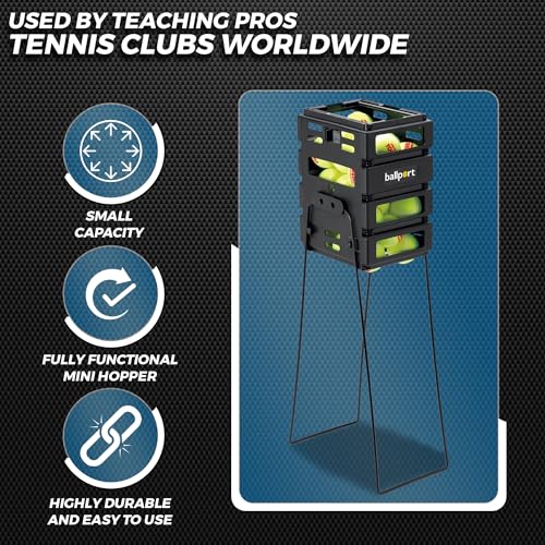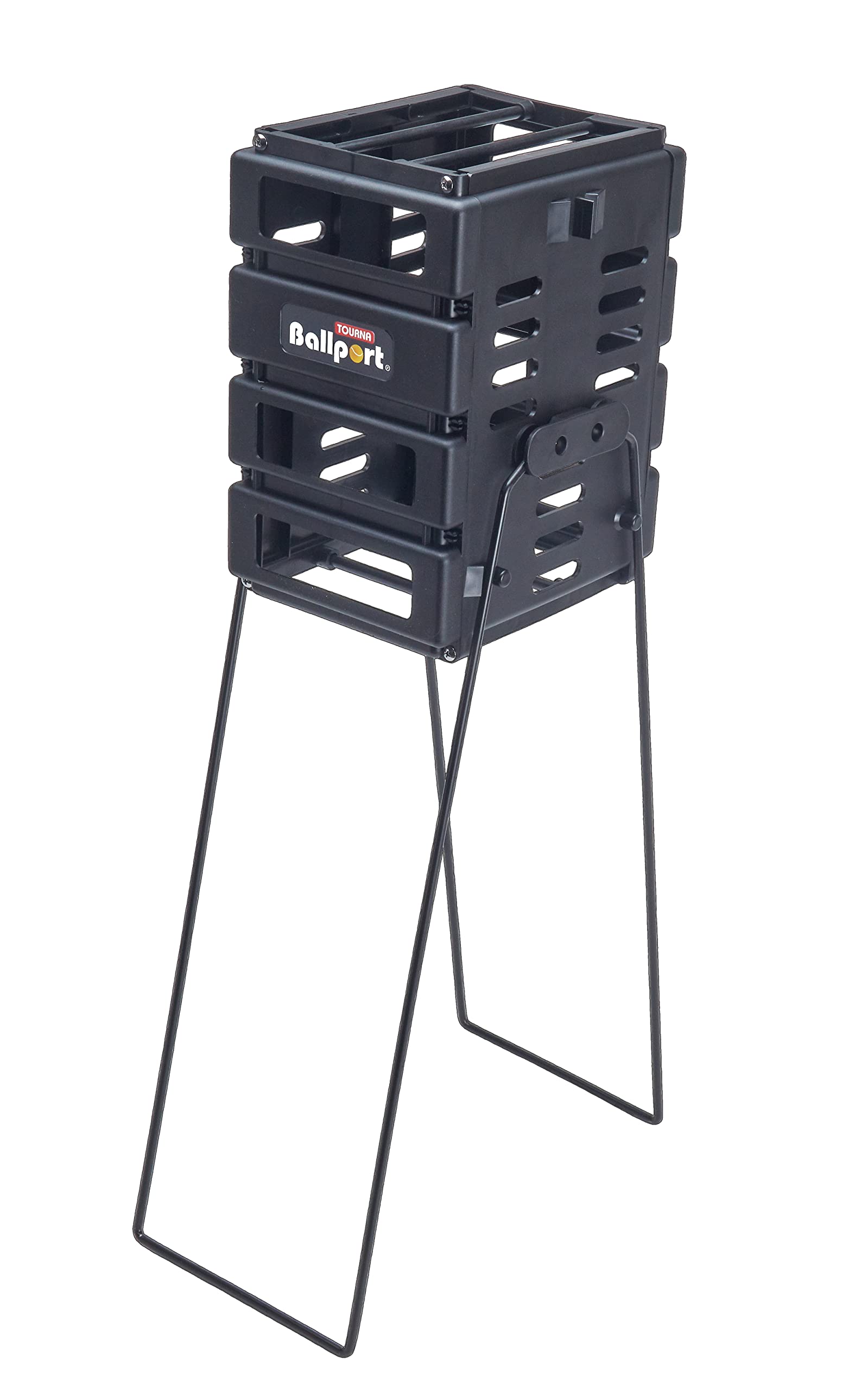 Details: Ballport® Mini holds 36 balls. Made of tough polypropylene, no wires to rust, welding to break, or paint to peel. Handles rotate and lock up or down. Assembly is easy with panels locking into place and legs easily attached with provided screws. Rolling bars on the bottom help ease balls into the basket and hold them in. Sliding bars on the top slide open to make dispensing easy, and lock closed to hold balls during transport and storage. Handles lock into an upright position for ball collection, and in a downward position for ball dispensing with a patented locking feature.